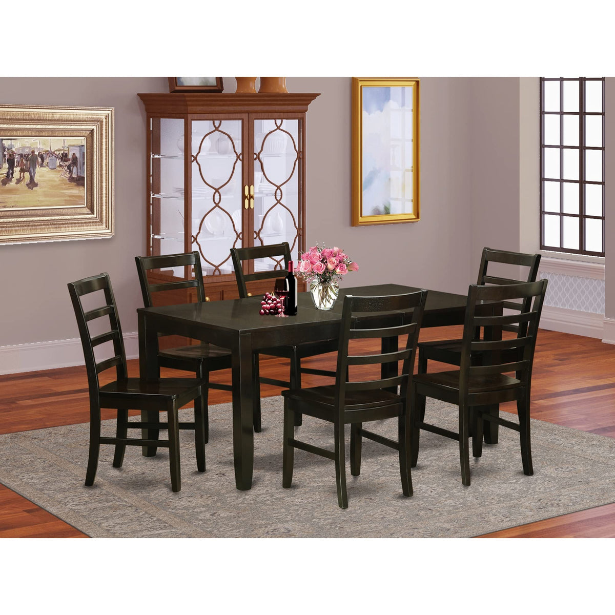 EAST WEST FURNITURE - LYPF7-CAP-W - KITCHEN DINING SETThis kitchen table set includes a breakfast table with a butterfly leaf and 6 contemporary chairs. The chairs have a ladder back design and a wooden seat, while the dinner table has a butterfly leaf top and four legs. The dining table features a rectangular top with a Cappuccino-colored finish, supported by four hardwood legs in the same hue. Similarly, the modern dining chairs have a wooden frame with a Cappuccino color. Our available set is made entirely from Rubberwood, also known as Asian wood, which is known for its durability and stability. The frame of this kitchen table set is carefully crafted from high-quality wood to ensure long-lasting quality. We have designed the set to be convenient and innovative, allowing for easy assembly of the self-storing butterfly leaf dinner table and chairs using the provided instructions. If you need any assistance, please don't hesitate to contact us. We prioritize customer satisfaction and guarantee the confidentiality of your purchase.PRODUCT FEATURES: Frame Material: Asian Wood Frame Color: Cappuccino Table Top Style: Rectangular Chair Back Style: Ladder Seat Material: Wood Chair Dimensions: Length: 22; Width: 18; Height: 38. Table Dimensions: Length: 66/54; Width: 36; Height: 30.Included in the Package: 6 Modern Dining Chairs and a Dinner Table.