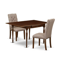 East West Furniture - Mzel3-Mah-16 - 3-Piece Dining Room Table Setthis 3-Piece Kitchen Table And Chairs Set, Featuring 2 Fabric Kitchen Chairs And A Drop-Leaf Rectangular Luxurious Wood Dining Table, Will Elevate The Luxury Of Your Dining Area Or Kitchen Space. Crafted From Durable Rubber Wood, A Sturdy Asian Wood, This Mid-Century Dining Table Set Is Built To Withstand Years Of Use While Providing Ergonomic Comfort. The Set Includes A Single Breakfast Table With Two Parson Dining Chairs, All Finished In Mahogany. The Wood Dining Table Set Adds Charm And Attractiveness To Your Kitchen Or Dining Room, Offering Flexibility And Comfort. The Compact Design Of The Kitchen Table Is Suitable For Small Areas, While The Kitchen Chair Seats Are Cushioned With Soft Linen Fabric And Supported By Solid Rubberwood Legs And A Stylish Linen Fabric Backrest With An Asian Wood Frame. The Chairs Also Feature A Soft Cushion And A Stylish Button-Tufted Backrest Design For Enhanced Comfort. The Kitchen Dining Table Set Brings A Touch Of Modern Charm To Your Home, Providing Ample Space For Your Family Or Friends. The Simplistic And Classy Style Is Accentuated By The Glossy Mahogany Finish. You Will Surely Enjoy The Comfort And Beauty Of This Wonderful Kitchen Table And Chairs Set. Assembly Is Quick And Easy With Basic Tools, As No Additional Tools Are Required. The Set Comes With Easy-To-Follow Instructions, Tools, And Hardware. Cleaning Up Dust Is A Breeze With The Help Of A Damp Cloth.Product Features: Frame Material: Asian Wood Chair Seat Color: Dark Khaki Dining Set Color: Mahogany Chair Dimension: Length: 24.5; Width: 19; Height: 40.5. Rectangular Dining Table Sizes: Length: 54/36; Width: 36; Height: 30.Included: A Lovely Drop Leaves Leaf Table And 2 Parson Chairs.