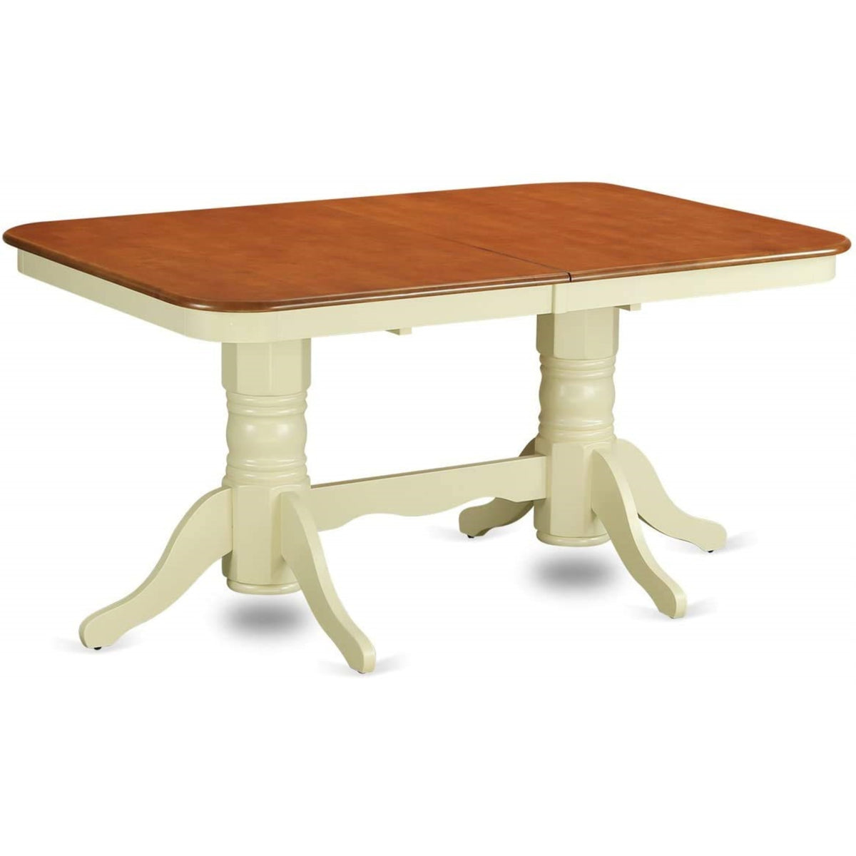EAST WEST FURNITURE - NAAV5-WHI-W - KITCHEN DINING TABLE SETThis dining table set comprises a contemporary table with a butterfly leaf and 4 dining chairs. The chairs have wooden seats and slatted backs, while the table features a butterfly leaf top and double pedestal legs. The breakfast table exhibits a beautiful and durable finish, seamlessly transitioning from a cherry table top to a buttermilk coating. The chairs' buttermilk-finished wooden legs and comfortable wooden seats bring a touch of modern style to any dining room atmosphere. Crafted with meticulous care from high-quality Asian Wood, specifically Rubberwood, our dining table set embodies a contemporary design. Rubberwood, renowned for its exceptional quality, provides a sturdy and long-lasting frame that will endure over time. This top-notch kitchen table set is ideal for various dining areas, whether you're hosting casual home parties or intimate gatherings. We strive to offer both innovation and convenience, ensuring a hassle-free assembly process. By following the provided instructions, you can easily assemble the kitchen table with a self-storing butterfly leaf and the accompanying wooden dining chairs. Should you encounter any difficulties, feel free to reach out to us for assistance. Rest assured that customer satisfaction is our utmost priority when purchasing our products.PRODUCT FEATURES: Frame Material: Asian Wood Frame Color: Buttermilk and Cherry Table Top Style: Rectangular Chair Back Style: Slatted Chair Seat Material: Wood Chair Dimensions: Length: 22; Width: 18; Height: 36. Table Dimensions: Length: 78/60; Width: 40; Height: 30.Included in the Package: 4 Modern Dining Chairs and a Wooden Kitchen Table.