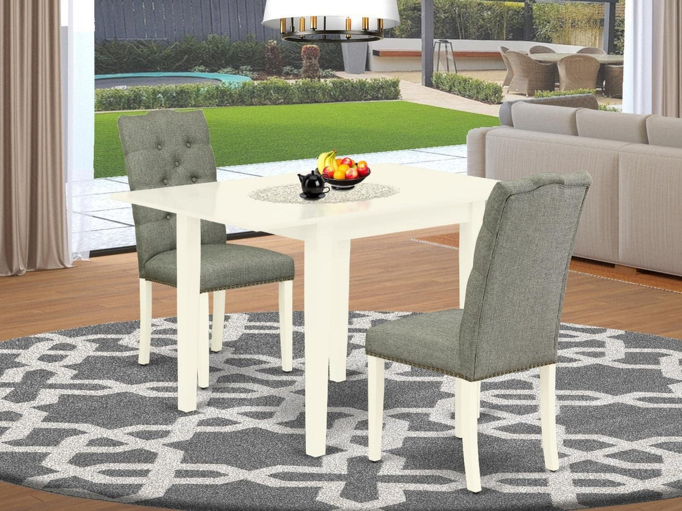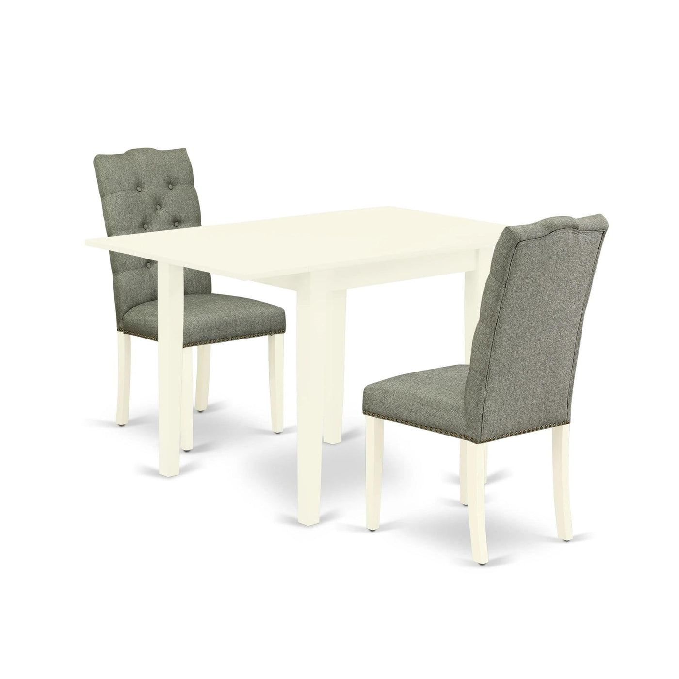 East West Furniture - Ndel3-Lwh-07 - Dining Room Seteast West Furniture 3-Piece Dinette Table Set Including 2 Padded Parson Chairs And A Drop Leave Rectangular Luxurious Living Room Table Will Improve The Beauty Of Your Dining Room Or Kitchen Areas. Our Wood Dining Table Set Is Manufactured From Solid Asian Wood, Known As Rubber Wood, Which Is Rugged Enough To Withstand Years Of Use. It Also Has An Ergonomic Design, Which Is Very Comfortable. Single Drop Leaves Rectangular Dining Table With 2 Dining Room Chairs Is In Linen White Finish. This Dinette Table Set Would Add Elegance And Attractiveness To Your Kitchen Or Dining Area. This Drop Leaves The Dining Room Table Is Flexible And Comfortable. This Dining Room Table Features A Compact Design Perfect For Small Areas. The Upholstered Dining Chair Seat Is Created From Soft Linen Fabric Cushion, With Solid Rubber Wood Legs And Stylish Soft Linen Fabric Backrest With Asian Wood Frame, Soft Cushion And Stylish Button Tufted Backrest Design To Make You More Cozy. Our Kitchen Dining Table Set Adds Some Modern Beauty To Your Home. Kitchen Chairs And A Dinette Table Offer Plenty Of Space For Your Family Or Friends. The Simplistic And Classy Style, Accentuated By A Glossy Linen White Finish. You Will Surely Enjoy This Gorgeous Dinette Table Set. It'S Easy To Put Together The Kitchen Parson Chairs And Drop Leaves The Breakfast Table With A Simple Tool. No Additional Tools Are Required. Easy-To-Follow Instructions, Tools, And Hardware Are Included. With The Help Of A Damp Cloth, You Will Clean Up Your Dusty Easily. Buy Our Products In Complete Confidence, Because Your Satisfaction Is Our #1 Priority. Feel Free To Contact Us, We Are Always Here For You.Product Features: Kitchen Parson Chairs Seat Color: Smoke Kitchen Parson Chair Legs Color: Linen White Kitchen Table Color: Linen White Parsons Chairs Sizes: Length: 24.5; Width: 19; Height: 40.5 Kitchen Table Sizes: Length: 30/48; Width: 30; Height: 30Included: A Dining Table And 2 Dining Chairs