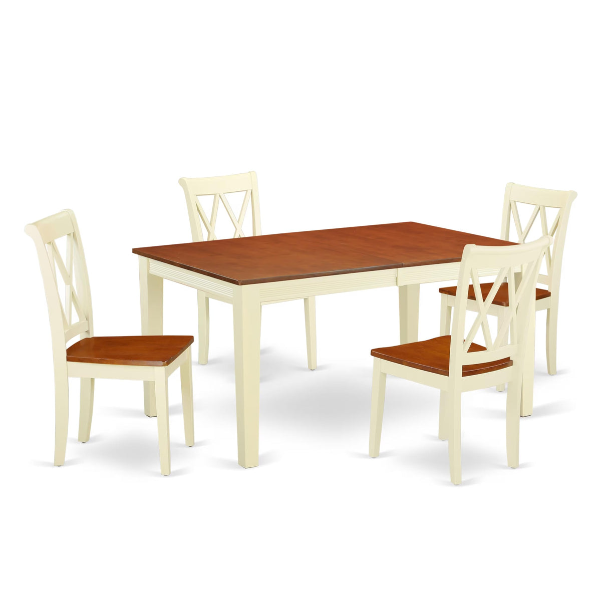 East West Furniture - Nicl5-Bmk-W - Dining Room Setelevate Your Kitchen With The Exclusive Dining Set In A Complementary Buttermilk And Cherry Color. This 5-Piece Set Includes A Sleek Table And 4 Exquisite Chairs, Exuding Elegance. The Modern Aesthetic Features A Glossy Rectangular Table Top And Stylish Wooden Seating. Seamlessly Blending With Various Decor Styles, It Effortlessly Integrates Into Your Space. The Kitchen Table'S Sleek Color Reflects Light, Brightening The Living Area And Showcasing The Chairs. The Extendable Leaf Expands The Dining Room For Personal Occasions Or Parties. The Dining Table'S Bevel Edge And Rounded Finish Fit Perfectly In Small Kitchens, Ideal For Compact Apartments. The Double X Back Kitchen Chairs In Buttermilk And Cherry Color Add Fashion And Comfort. Crafted From Hardwood, They Offer Stability And A Sturdy Finish. The Chairs' Frame Ensures Spinal Support, Reducing The Chances Of Back Pain. Made From High-Grade Asian Wood, This Durable Dining Set Is Crafted With Expertise, Boasting A Stunning Appearance. Its Standard Shape And Size Enhance The Attractiveness Of The Dining Area. This Budget-Friendly Set Provides A Comfortable And Memorable Dining Experience With Family And Friends.Product Features: Material: Asian Hardwood Color: Buttermilk And Cherry Table Dimensions: Length: 66/54; Width: 36; Height: 30. Chair Dimensions: Length: 22; Width: 18; Height: 37. Weight Capacity: 300 Lbs.Includes: A Rectangular Table And 4 Wooden Chairshardware Package And Instruction Manual Are Located In/Under The Seat.