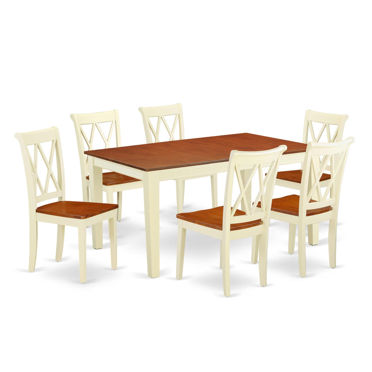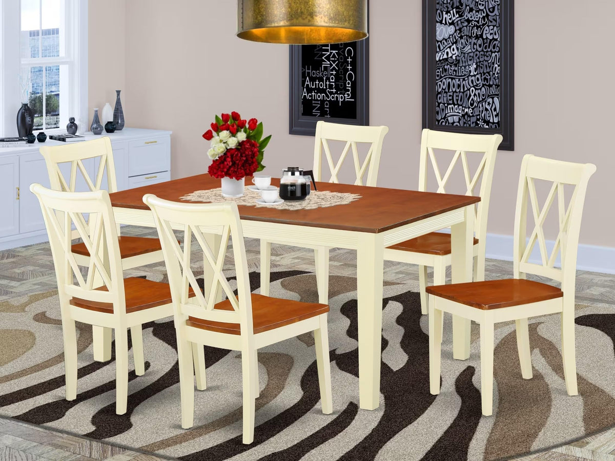 East West Furniture - Nicl7-Bmk-W - Dining Room Setintroducing Our Exclusive Dining Set Featuring A Charming Combination Of Buttermilk And Cherry Color That Complements Various Attractive Themes. This Set Includes A Sophisticated Rectangular Wooden Dining Table And 6 Premium Mid-Century 4 Dining Chairs, Enhancing The Aesthetic Appeal Of Any Dining Room With Its Stylish Design And Exquisite Decoration. We Are Confident That Our Inspiring Design, Exceptional Quality, And Remarkable Durability Will Exceed Your Expectations. The Sleek Color Of The Kitchen Table Subtly Reflects Light, Brightening Up The Living Area And Showcasing The Dining Room Tables And Chairs. The Extendable Leaf Easily Expands The Dining Room For Personal Occasions Or Great Parties. The Chairs, Finished In Buttermilk And Cherry Color, Offer Fashionable And Cozy Seating With Their Slender Double X-Back Design And Wood Seats. Crafted From Hardwood, These Chairs Provide Stability And A Sturdy Finish. The Matching Color Of The Chairs With The Table Brings A Good Contrast In The Kitchen Area. Our Dining Set, Made From Premium Rubberwood, Ensures Exceptional Durability And Timeless Beauty. With Its Contemporary Style, Budget-Friendly Nature, And Comfort, It'S The Perfect Choice For Enjoyable Dining Experiences With Family And Friends.Product Features: Material: Asian Hardwood Color: Buttermilk And Cherry Table Dimensions: Length: 66/54; Width: 36; Height: 30. Chair Dimensions: Length: 22; Width: 18; Height: 37. Weight Capacity: 300 Lbs.Includes: A Rectangular Table And 6 Wooden Chairshardware Package And Instruction Manual Are Located In/Under The Seat.