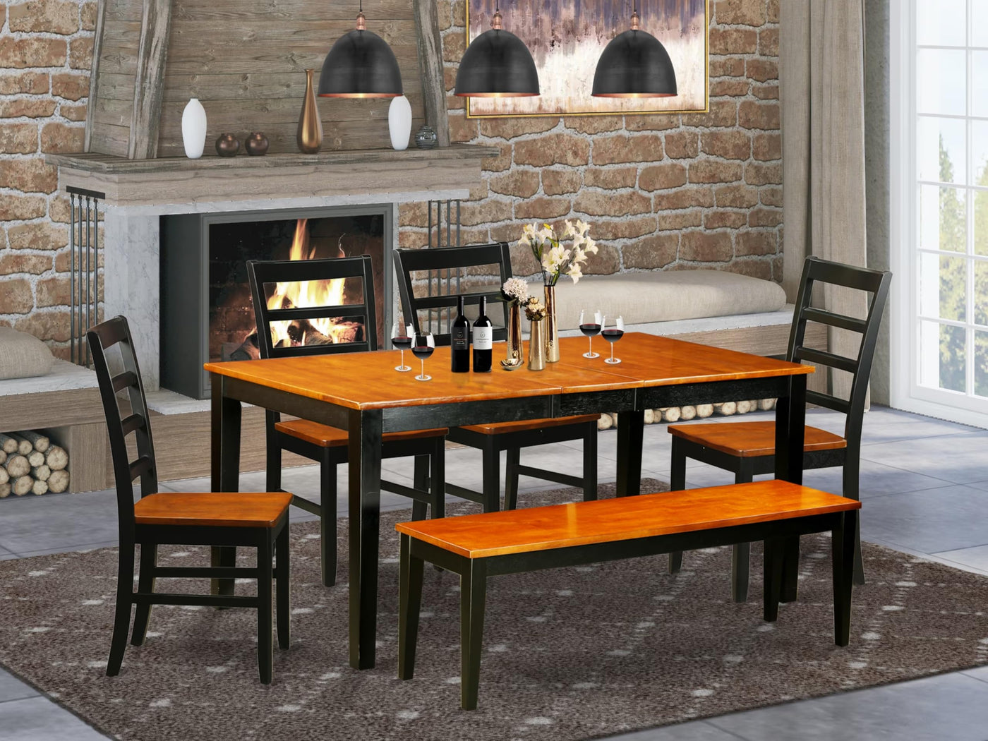 EAST WEST FURNITURE - NIPF6-BCH-W - DINNER TABLE SETIntroducing our exclusive 6-piece dinner table set, thoughtfully curated to add a touch of sophistication and charm to your dining room. This meticulously designed ensemble boasts a butterfly leaf wood table, complemented by 4 exquisitely crafted dinner chairs featuring wooden seats and a tasteful Ladder Back design, along with a dining bench exuding elegance with its wooden seat. The kitchen table and dining bench showcase a rectangular top in a beautiful Cherry color, supported by sturdy hardwood 4 legs. Complementing the set, our dining room chairs come with Black 4 Legs and comfortable wooden seats. Our classical dining set showcases timeless elegance, meticulously crafted from premium Asian wood, commonly known as Rubberwood. Our team of highly skilled and experienced carpenters has meticulously ensured a flawless and refined finish for this modern dining set, showcasing premium quality and durability. Ideal for both casual home gatherings and intimate soirées, this versatile kitchen table set embodies both style and functionality. The assembly process is effortless with our self-storing butterfly leaf wooden table, dining room bench, and wooden kitchen chairs, accompanied by detailed instructions for seamless setup. Your satisfaction is our topmost priority, and we take pride in providing innovative designs that offer the utmost ease and timeless appeal.PRODUCT FEATURES: Frame Material: Asian Wood Frame Color: Black and Cherry Table Top Style: Rectangular Chair Back Style: Ladder Seat Material: Wood Chair Dimensions: Length: 22; Width: 18; Height: 38. Table Dimensions: Length: 66/54; Width: 36; Height: 30. Bench Dimension: Length: 54; Width: 15; Height: 17.Included in the Package: 4 Dining Chairs, a Kitchen Bench and a Dining Table.