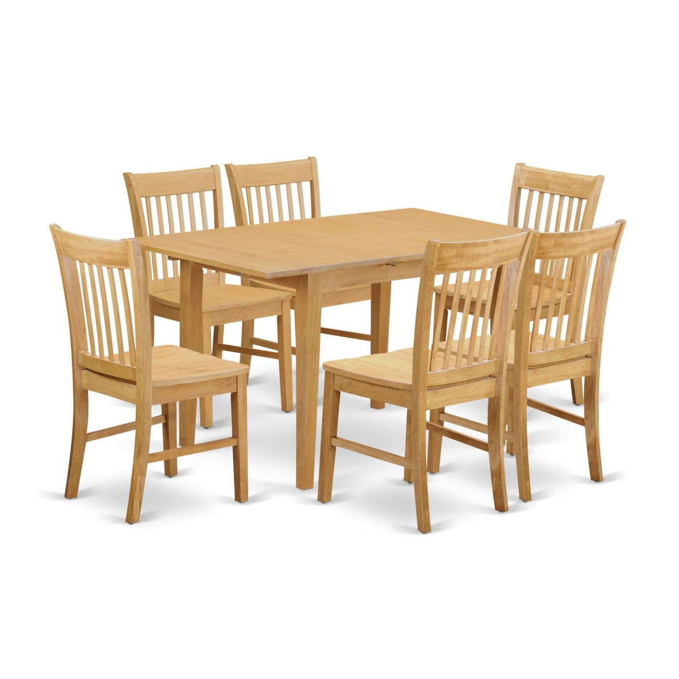 EAST WEST FURNITURE - NOFK7-OAK-W - DINING TABLE SETIts dining table set includes 6 dining chairs and an astounding 4 legs dining table. The wood dining table set gives an Oak wood dining table and dining chairs that will boost the luxury of your dining room. This small dining table is manufactured from high-quality rubber wood. These dining chairs have been crafted from superior quality wood that can Endurance to 300lbs weight. This dining table set is colored with a top-quality Oak finish. You can clean this dining table set easily with any furniture clearance. This dining table set assembles easily due to its simple design. You can put together this Rectangular dinette set from one place to another easily. The dining table set is one of the most important pieces of furniture in your house. It not only becomes the place to eat meals, but it's where you end up working on vegetable cuts and spending time with family and friends.PRODUCT FEATURES: Material: Rubber Wood Frame Color: Oak finish Chairs Seat Material: Wood Table Top Style: Rectangular Chairs Back Style: Slatted Dimension of Table: Length: 53.5/42; Width: 31.5; Height: 29. Dimension of Chairs: Length: 19; Width: 18; Height: 35.Included package: 6 Dining Chairs and a Dinner Table.