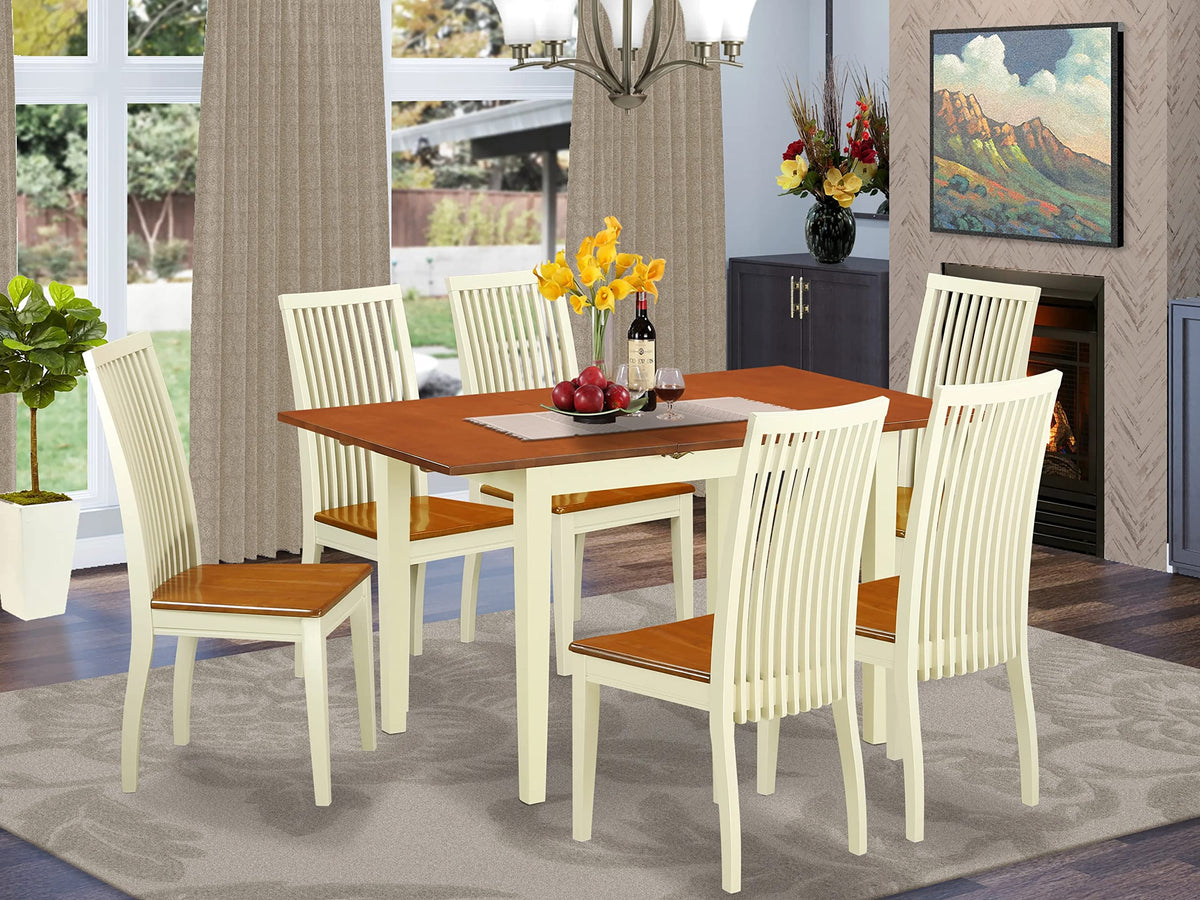 EAST WEST FURNITURE - NOIP7-BMK-W - DINING TABLE SETExperience the sophistication of our meticulously crafted 7-Pc kitchen room set, complete with a beautifully designed butterfly leaf wood dining table and six top-quality dining room chairs. Elevate any dining space with its stylish aesthetics and exquisite decor, exuding an aura of professionalism and refinement. Introducing our elegant kitchen dining table, showcasing a cherry table top expertly finished in Buttermilk for lasting appeal. Its versatile design seamlessly complements any decor, adding a touch of sophistication to your dining space. Presenting our exquisitely designed dining room table set, meticulously crafted from premium-grade Asian rubberwood, renowned for its exceptional quality. This mid-century modern dining set boasts unparalleled durability, a true testament to the utilization of this high-caliber material during the manufacturing process. These exquisite mid-century dining chairs feature a hardwood seat material, delivering a truly refined sitting experience. The thoughtfully designed backrest aligns perfectly with the natural curvature of the spine, guaranteeing optimal comfort with every seating arrangement. Furthermore, the generously proportioned seats contribute to an enhanced level of overall comfort.PRODUCT FEATURES: Frame Material: Asian Wood Frame Color: Buttermilk and Cherry Table Top Style: Rectangular Chair Back Style: Slatted Chair Seat Material: Wood Chair Dimensions: Length: 21; Width: 18; Height: 39. Table Dimensions: Length: 53.5/42; Width: 31.5; Height: 29.Included in the Package: 6 Modern Chairs and a Wood Dining Table.