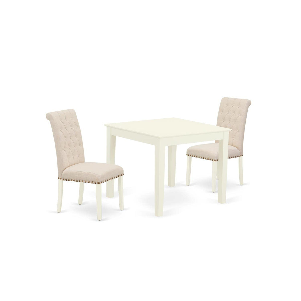 East West Furniture - Oxbr3-Lwh-02 - 3-Piece Kitchen Table Setthis Specific 3-Piece Kitchen Set Includes A Kitchen Table And 2 Parson Chairs. The Square Small Dining Table Features Fresh And Clean Lines In Its Cutting-Edge Design, Complemented By A Linen White Finish That Adds A Glimmer And Shadow Effect To The Legs. Made From Prime Quality Rubberwood, The Table Is Stable And Durable Without Using Heat-Treated Pressured Wood. The Regal Parson Chairs Offer Beauty And Sensible Seating Arrangements. Upholstered In Linen Fabric With High-Density Foam Padding, They Have A Tall Back And Solid Hardwood Frame Construction, Ensuring Comfort And Durability. Easy To Assemble, They Are A Stylish Answer To Your Seating Needs. The Dining Set'S Standard Shape, Size, And Design Make The Dining Area Significantly Attractive. It Is A Contemporary, Budget-Friendly, Durable, And Comfortable Option For A Great Dining Time Experience With Family Or Friends.Product Features: Material: Asian Hardwood Color: Linen White Fabric: Linen Fabric Cushion Material: Foam Fabric Color: Light Beige Leg Color: Linen White Table Dimensions: Length: 36; Width: 36; Height: 30. Chair Dimensions: Length: 26.5; Width: 19.2; Height: 41.2. Weight Capacity: 300 Lbsincludes: 1 Square Table And 2 Parson Chairs.