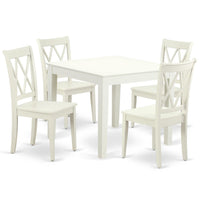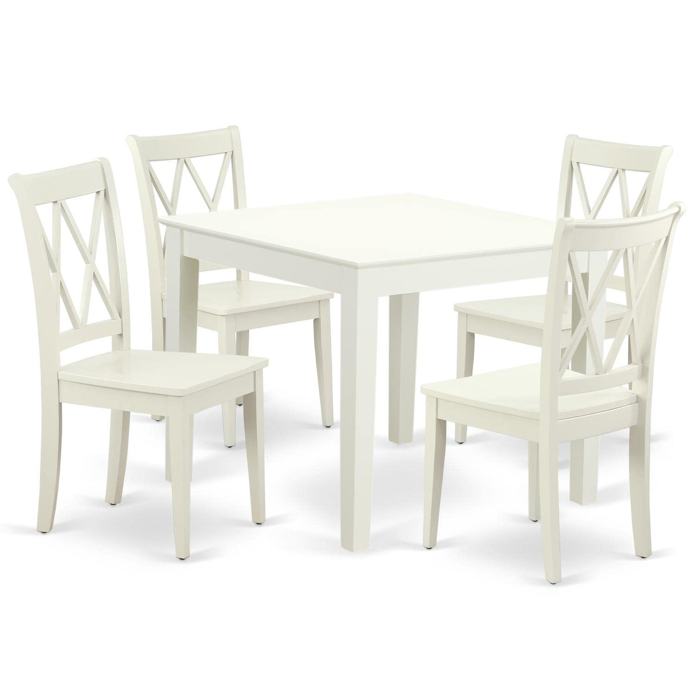 East West Furniture - Oxcl5-Lwh-W- 5 Piece Dining Table Setintroducing An Exquisite 5-Piece Contemporary Dining Set, Including 4 Sleek Dining Room Chairs And A Stunning Square Table. The Timeless Design Enhances Any Dining Room With Its Sleek Linen White Finish, Complementing Any Home Decor Style. The Square Small Kitchen Table Features Clean Lines And A Beveled Tabletop, While The Chairs Offer Fashionable, Comfortable Seating With A Rich Linen White Finish And Sturdy Hardwood Construction. The Matching Color Scheme Creates A Pleasing Contrast In The Kitchen Area, Adding Elegance And Class. Crafted From 100% Solid Wood, This Set Ensures Durability Without Compromising On Quality. Say Goodbye To Back Pain With The Chairs' Spine-Friendly Design. Enjoy A Great Dining Experience With Family And Friends Thanks To This Contemporary, Budget-Friendly, And Comfortable Dining Set.Product Features: Material: Asian Hardwood Color: Linen White Table Dimensions: Length: 36; Width: 36; Height: 30. Chair Dimensions: Length: 22; Width: 18; Height: 37. Weight Capacity: 300 Lbs.Includes: 1 Square Table And 4 Wooden Chairs."