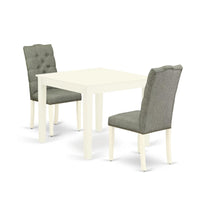 East West Furniture - Oxel3-Lwh-07- 5-Pc Dining Room Table Setelevate Your Dining Area With This 3-Piece Modern Dining Table Set. It Includes 2 Parsons Dining Chairs And A Luxurious Rectangular Wood Dining Table In A Chic Linen White Finish, Suitable For Any Decor. The Chairs Boast A Stylish Retro Design With Smoke Color Fabric And Linen White Wooden Legs. Crafted From Solid Asian Rubber Wood, The Set Offers Durability And Comfort. The Compact Design Is Perfect For Small Spaces. The Kitchen Parson Chairs Feature Soft Linen Fabric Seat Cushions And A Button-Tufted Backrest, Ensuring A Cozy Dining Experience. With Its Glossy Finish And Elegant Design, This Dining Table Set Adds Modern Charm To Your Home. Ample Space Is Provided For Family Or Friends To Gather. Assembly Is Easy With The Included Tool, And Maintenance Is A Breeze With A Damp Cloth. Transform Your Kitchen Or Dining Room With This Attractive And Comfortable Wood Dining Table Set.Product Features: Frame Material: Rubber Wood Seat Color: Smoke Frame Color: Linen White Table Sizes: Length: 36; Width: 36; Height: 30. Chair Sizes: Length: 24.5; Width: 19; Height: 40.5.Included: A Dining Room Table And 2 Dining Room Chairs.