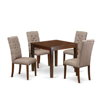 East West Furniture - Oxel5-Mah-16 - 5-Piece Kitchen Setour Kitchen Table Set Includes 4 Amazing Parsons Dining Chairs And A Fantastic 4-Legged Wood Dining Table. The Modern Small Dining Table Set Delivers A Mahogany Solid Wood Dining Table And Dark Khaki Dining Room Chairs With A High Back That Adds Luxury To Your Living Area. The High-Quality Chairs Provide Comfort And Relaxation During Meals, With A Sturdy Rubber Wood Construction That Can Hold Up To 300 Lbs. The Dining Chairs Feature A Hardwood Frame With A Quality Foam Seat Covered In Linen Fabric For Added Comfort. The Premium Mahogany Finish Of The Table And Dark Khaki Finish Of The Chairs Enhance The Beauty Of Your Dining Area. East West Furniture Ensures Innovative And Easy-To-Assemble Pieces. This High-Class Dining Set Is Perfect For Your Living Area And Kitchen, Suitable For Casual Home Parties.Product Features: Wood Color: Mahogany Fabric Material: Linen Fabric Fabric Color: Dark Khaki Table Measurement: Length: 36; Width: 36; Height: 30. Chairs Measurements: Length: 24.5; Width: 19; Height: 40.5.Package Include: 4 Parson Chairs And A Wood Table.