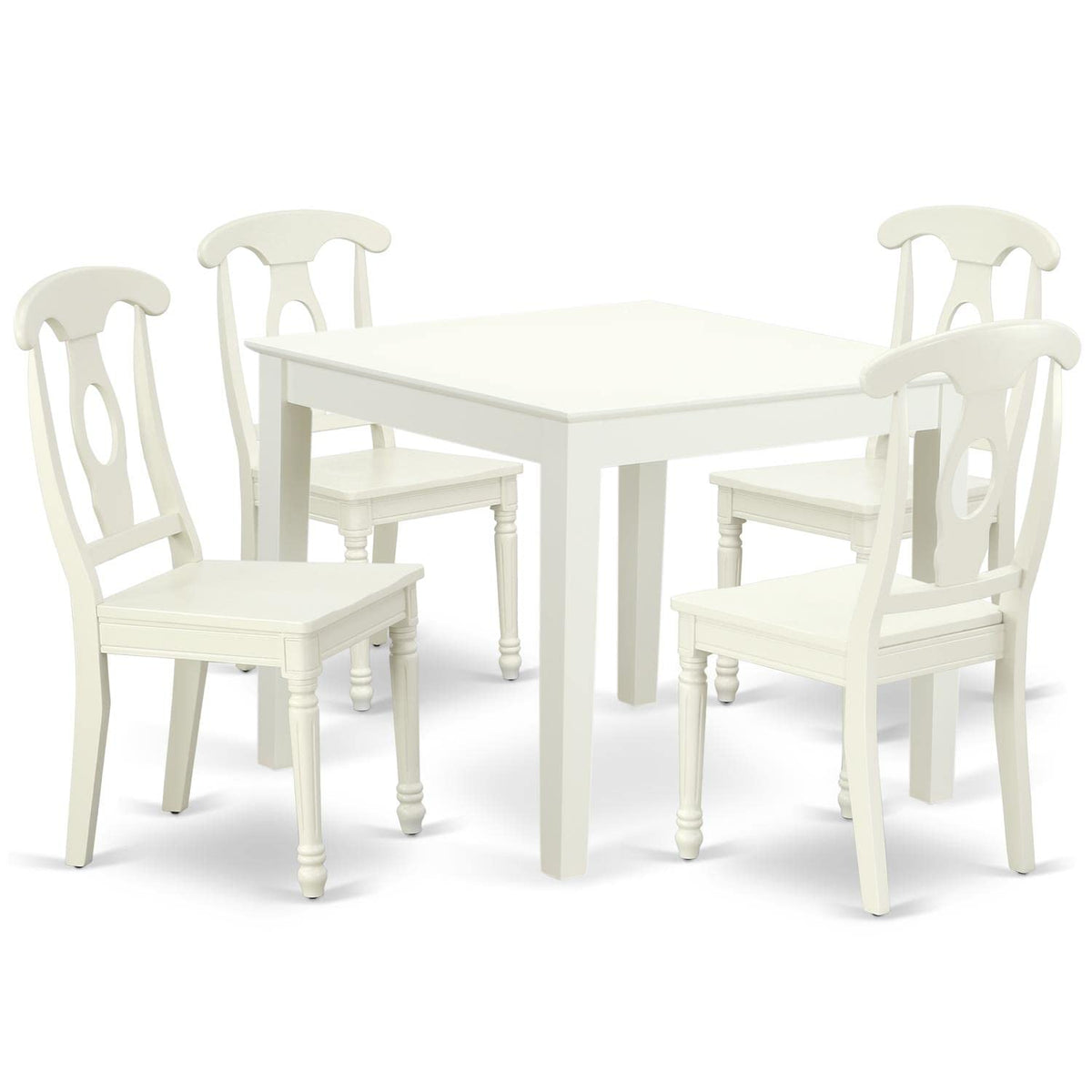 East West Furniture - Oxke5-Lwh-W - 5-Piece Kitchen Table Setpresenting An Exquisite 5-Piece Dining Set, Featuring 4 Elegant Dining Chairs And A Beautifully Designed Square Dining Table. This Ensemble Adds A Definitive Touch Of Sophistication To Any Dining Space, Reflecting Traditional Aesthetics That Emanate Timeless Charm, Thereby Enhancing The Overall Appeal Of Your Dining Room. The Dining Table'S Surface Is Adorned With An Exquisite Linen White Finish, Gracefully Accompanied By Legs That Are Meticulously Coordinated. In A Parallel Manner, The Wooden Chairs Showcase Impeccably Crafted Linen White Seats And Legs. This Contemporary Dining Set Has Been Meticulously Handcrafted From Top-Tier Asian Hardwood, Guaranteeing Unparalleled Stability And Exceptional Durability. The Ergonomically Designed High-Density Seats And Backrests Ensure Optimal Comfort, Even During Extended Periods Of Sitting. These Exquisite Dining Chairs Are Meticulously Crafted Using High-Quality Hardwood, Ensuring An Unparalleled Seating Experience. The Meticulously Designed Elevated Backrest Seamlessly Aligns With The Natural Curvature Of The Spine, Facilitating Consistently Comfortable Seating. If You Follow The Provided Instructions, You'Ll Find It Easy To Put Together A Wooden Dining Table With An Accompanying Kitchen Chair. Don'T Hesitate To Reach Out If You Encounter Any Difficulties.Product Features: Material: Asian Hardwood Color: Linen White Table Dimensions: Length: 36; Width: 36; Height: 30. Chair Dimensions: Length: 21; Width: 18; Height: 38. Weight Capacity: 300 Lbs.Includes: A Square Table And 4 Wooden Chairs.Hardware Package And Instruction Manual Are Located In/Under The Seat.
