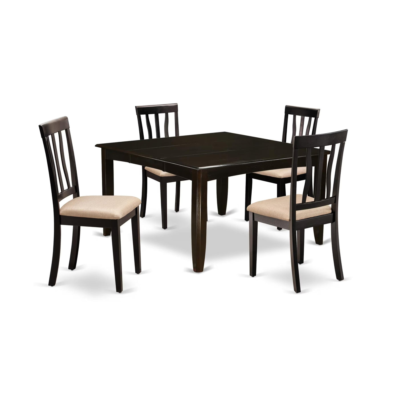 EAST WEST FURNITURE - PFAN5-CAP-C - DINING ROOM SETPresenting a 5-piece modern dinner table set 4 dining room chairs with a butterfly leaf dining table. The table boasts a Cappuccino Color Table Top and Hardwood 4 Legs, complementing the Cappuccino 4 Legs of the chairs. These wooden kitchen chairs and mid-century dining table blend seamlessly with any room decor. The set exudes elegance through its high-class color combination, adding sophistication to your home. Dining chairs feature Linen Fabric seats and slatted backs, while the table offers a butterfly leaf top and 4 legs. Crafted from durable Asian rubber wood, the set ensures strength. Skilled carpenters meticulously designed the dining chairs and mid-century dining table, resulting in a polished finish that elevates the set's appeal. The assembly is hassle-free with provided instructions. We're here to assist if needed. With customer happiness as our priority, purchase confidently. This premium modern dining set is ideal for casual home parties or intimate gatherings, providing both innovation and ease. Elevate your dining area effortlessly.PRODUCT FEATURES: Frame Material: Asian Wood Frame Color: Cappuccino Seat Material: Linen Fabric Chair Dimensions: Length: 20; Width: 18; Height: 38.5. Table Dimensions: Length: 54/36; Width: 54; Height: 30.Included in the Package: 4 Dinner Chairs and a Modern Table.