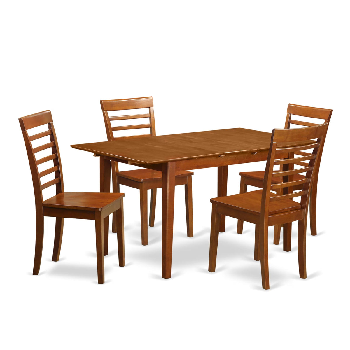 EAST WEST FURNITURE - PSML5-SBR-W - 5-PIECE MODERN DINING SETIntroducing our exquisite 5-piece dining room ensemble, complete with a sleek modern dining table and 4 refined kitchen chairs. The chairs' contemporary design exudes an air of sophistication, elevating the aesthetic allure of any dining area. The impeccable craftsmanship displayed in our dining room chairs and the exquisite table underscores their seamless integration with a diverse array of room décors, thanks to their enduring classic design. We are proud to unveil our sophisticated dining table ensemble, meticulously curated to elevate your dining space. Our centerpiece boasts a meticulously crafted table, adorned with a refined Saddle Brown Color Table Top, flawlessly complemented by an impeccably matched Saddle Brown Finish. This traditional kitchen dining table set has been meticulously handcrafted using exquisite Asian Rubberwood, a premium timber renowned for its exceptional quality. The dining room set's frame is meticulously constructed from top-tier solid wood, ensuring unparalleled durability and stability. The wooden chairs are distinguished by their meticulously handcrafted wooden seats, augmenting the overall visual allure of the kitchen space. The generously proportioned seats contribute to an exceptional standard of comfort, prioritizing a gratifying seating experience.PRODUCT FEATURES: Frame Material: Asian Solid Wood chairs Seating Material: Wood Chairs Color: Saddle Brown Dining Table Color: Saddle Brown Chair Dimensions: Length: 22; Width: 17; Height: 38. Table Dimensions: Length: 60/48; Width: 32; Height: 30.Include in the Package: 5-Pc Dining Room Table Set 4 Wood Chair and 1 Dining Table.