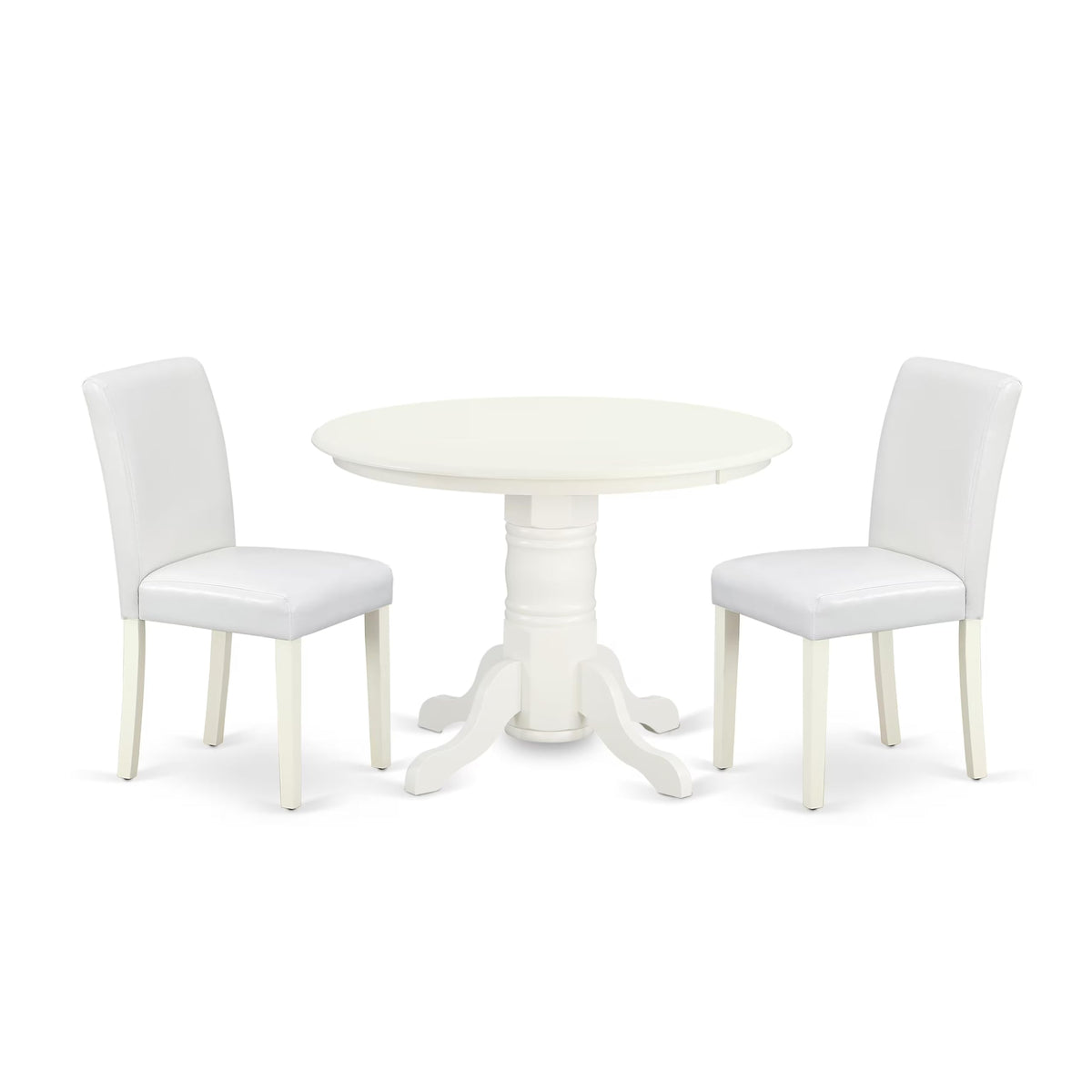 East West Furniture - Shab3-Lwh-64 3-Piece Dining Table Setunveiling A Meticulously Curated 3-Piece Dining Room Table Set, Comprising Of A Gracefully Designed Round Pedestal Dining Table And 2 Exquisitely Crafted Dining Room Chairs. This Ensemble Collectively Emanates An Aura Of Classical Sophistication, Poised To Enrich Any Residential Setting With Its Refined Presence. Presenting Our Exquisite Mid-Century Modern Dining Table Set That Embodies Meticulous Design Elements. The Table Features A Refined Linen White Tabletop, Seamlessly Paired With Legs Expertly Finished In The Same Sophisticated Linen White Tone. In Perfect Harmony, Our Meticulously Crafted Mid-Century Modern Chairs Showcase Seats Upholstered In White Pu Leather, Elegantly Supported By Four Meticulously Designed Wooden Legs, All Finished In The Pristine Linen White Shade. This Exquisite Kitchen Set Is Meticulously Constructed Using The Finest Asian Rubberwood, Renowned For Its Exceptional Quality. The Integration Of Anti-Slip Protectors On Each Leg Serves A Dual Function, Preventing Both Slippage And The Possibility Of Floor Scratches. These Parsons Chairs Showcase A Refined And Sophisticated Design, Featuring An Elegant Chair Back Paired With A Faux Leather Seat That Adds A Touch Of Opulence To The Kitchen Space. The Generously Proportioned Seat Not Only Enhances Comfort But Also Accommodates A Diverse Range Of Body Types.Product Features: Material: Asian Hardwood Color: Linen White Fabric: Pu Leather Cushion Material: Foam Table Dimensions: Length: 42; Width: 42; Height: 30. Chair Dimensions: Length: 22; Width: 17.20; Height: 35.20. Weight Capacity: 300 Lbs.Includes: 1 Round Table And 2 Parson Chairs.