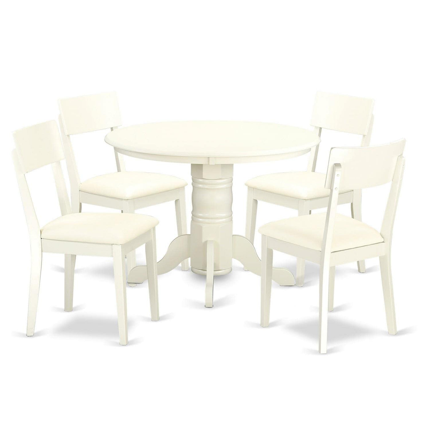 East West Furniture - Shad5-Lwh-Lc - Dining Table Setthis 5-Piece Modern Dining Table Set Includes 4 Dining Chairs And A Dinner Table. These Dining Chairs Have A Faux Leather Seat, Ladder Back And The Modern Table Consists Of A Round Top And A Pedestal Leg. It Increases The Grace Your Dining Room. We Have Crafted These Dining Room Chairs And Modern Dining Table With The Help Highly Experienced Carpenters, Who Develop A Smooth And High-End Finish To This Dinette Set. This Premium Quality Modern Dining Table Set Is Ideal For You And Any Dining Area. This Dining Room Set Can Be Used For Casual Home Parties Or Intimate Gatherings. We Try To Provide Innovation As Well As Ease To Put Together. You Can Assemble A Kitchen Table And Dining Chairs Quickly According To The Instructions If You Have Any Trouble Feel Free To Contact Us. Buy Our Products Confidentially, Because Our 1St Priority Is To Keep Customers Happy!Product Features: Material: Asian Wood Frame Color: Linen White Table Top Style: Round Chair Back Style: Ladder Seat Material: Faux Leather Chair Dimensions: Length: 21; Width: 17; Height: 36. Table Dimensions: Length: 42; Width: 42; Height: 30.Included In The Package: 4 Dinner Chairs And A Kitchen Table.