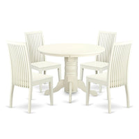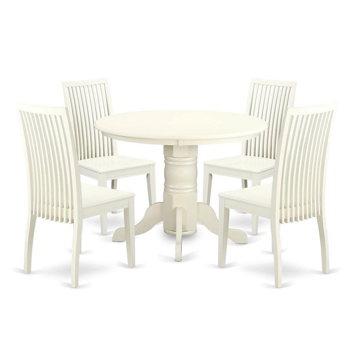 East West Furniture - Ship5-Lwh-W - Dinette Table Setthis 5-Piece Dinner Table Set Includes 4 Dining Room Chairs And A Dinner Table. These Modern Chairs Have A Wooden Seat, Slatted Back And The Dinner Table Consists Of A Round Top And A Pedestal Leg. It Enhances The Charm Of Your Dining Room. We Have Designed These Dinning Chairs And Dinner Table With The Help Highly Experienced Carpenters, Who Develop A Smooth And High-End Finish To This Dinette Set. This High Quality Dining Room Set Is Ideal For You And Any Dining Area. This Kitchen Table Can Be Used For Casual Home Parties Or Intimate Gatherings. We Try To Give Innovation As Well As Ease To Put Together. You Can Assemble A Modern Table And Dinner Chairs Quickly According To The Instructions If You Have Any Trouble Feel Free To Contact Us. Buy Our Products Confidentially, Because Our 1St Priority Is To Keep Customers Happy!Product Features: Material: Asian Wood Frame Color: Linen White (F White) Table Top Style: Round Chair Back Style: Slatted Seat Material: Wood Chair Dimensions: Length: 21; Width: 18; Height: 39. Table Dimensions: Length: 42; Width: 42; Height: 30.Included In The Package: 4 Dinner Chairs And A Round Table.