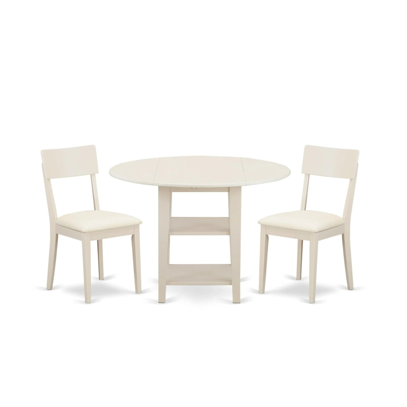 East West Furniture SUAD3-LWH-LC 3 Piece Dining Set Contains a Round Dining Room Table with Dropleaf & Shelves and 2 Faux Leather Upholstered Chairs, 42x42 Inch, Linen White