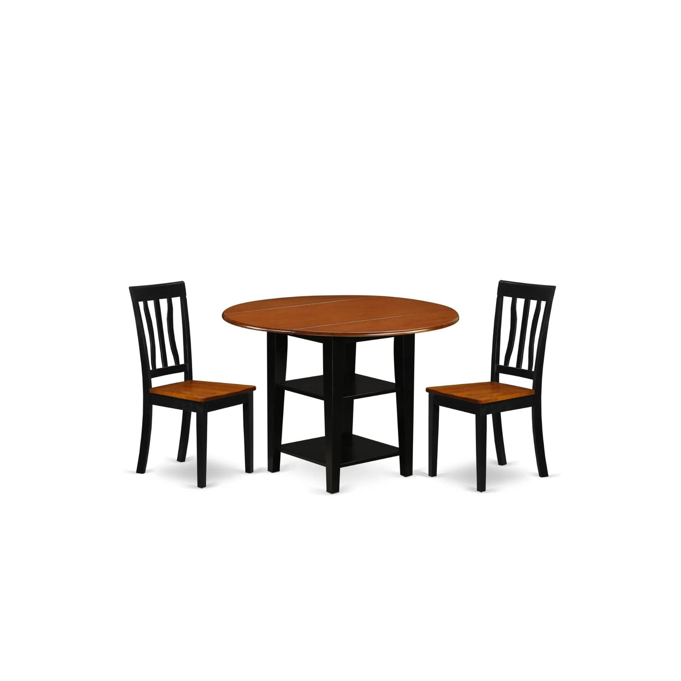 East West Furniture Suan3-Bch-W 3 Piece Dining Room Table Set Contains A Round Dining Table With Dropleaf & Shelves And 2 Wood Seat Chairs, 42X42 Inch, Black & Cherry