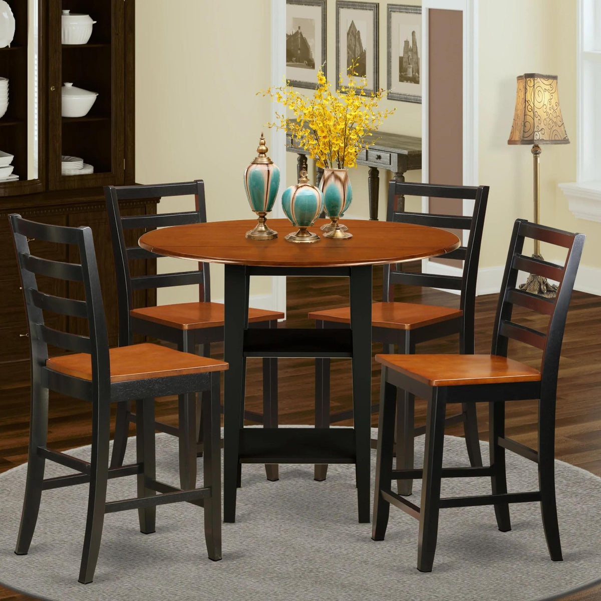 DescriptionEAST WEST FURNITURE - SUFA5H-BCH-W - KITCHEN TABLE SETThis meticulously 5-piece dining table room set, a stylish round modern dining table with 4 tastefully designed dining chairs, effortlessly imparts a sense of innovation and refined elegance to any dining environment. Our exceptional dining table ensemble stands as a testament to cutting-edge design and progressive aesthetics. The dining ensemble consists of a round drop-leaf table with a sophisticated cherry-colored tabletop impeccably matched with meticulously finished black legs. In perfect harmony the dining chairs showcase cherry-toned seats and finely crafted black legs. This elegant dining table set has been meticulously crafted from the finest Asian rubberwood, renowned for its exceptional quality. The remarkable durability of our mid-century modern dining set stands as a testament to the excellence of this material. Our dining chairs are furnished with high-quality wooden seats that enhance the overall sophistication of your kitchen. Moreover, their generously proportioned seating area ensures superior comfort. Our wooden chairs showcase a thoughtfully designed backrest that seamlessly complements a diverse range of interior design aesthetics, including rustic and contemporary themes.PRODUCT FEATURES: Frame Material: Asian Wood Frame Color: Black and Cherry Table Top Style: Round Chair Back Style: Ladder Seat Material: Wood Chair Dimensions: Length: 21; Width: 17; Height: 41. Table Dimensions: Length: 42; Width: 42; Height: 29.5.Included in the Package: 4 Modern Dining Chairs and a Dinner Table.
