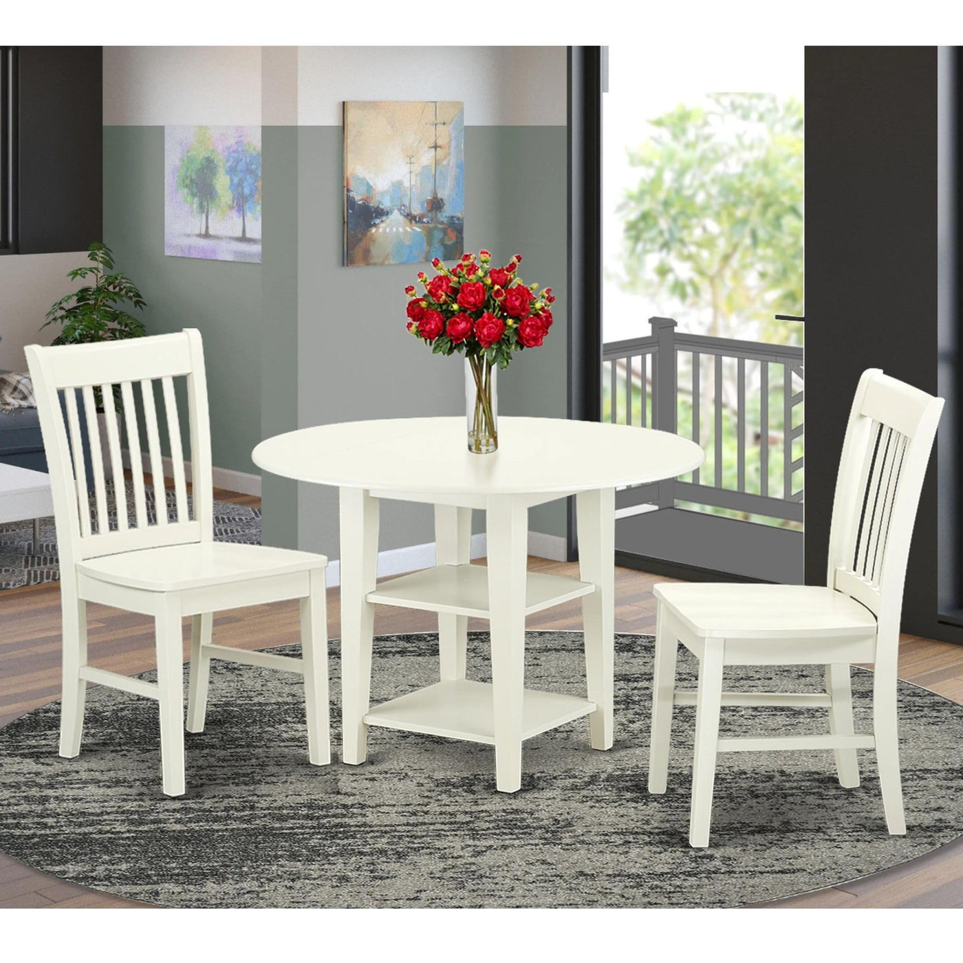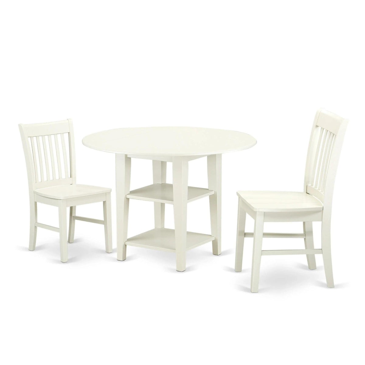 East West Furniture SUNO3-LWH-W 3 Piece Dining Room Furniture Set Contains a Round Kitchen Table with Dropleaf & Shelves and 2 Dining Chairs, 42x42 Inch, Linen White