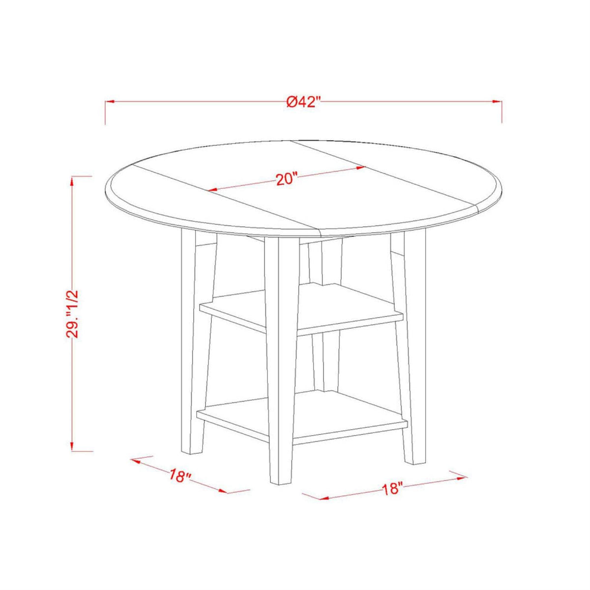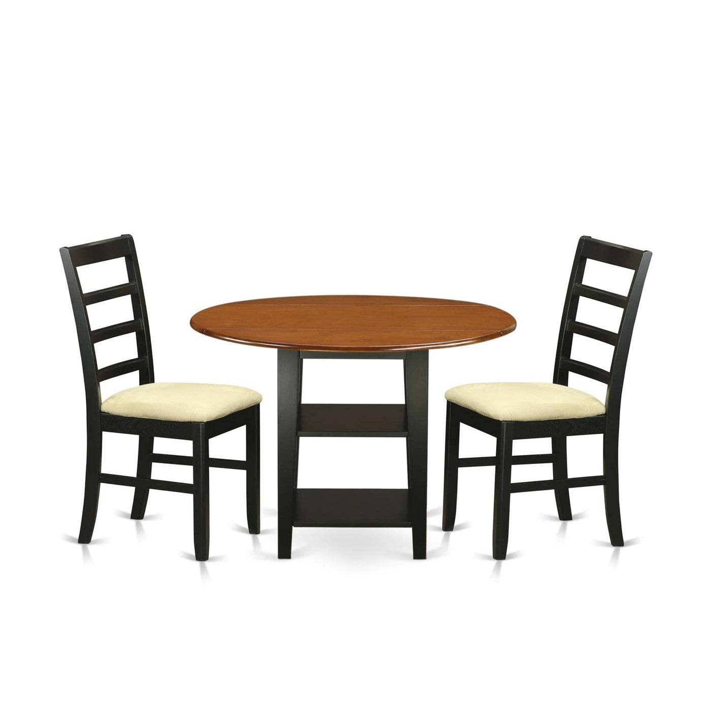 EAST WEST FURNITURE - SUPF3-BCH-C - kitchen SETThis modern 3-piece dining set includes 2 dining chairs and a wooden table. The dining table features a durable Cherry tabletop seamlessly combined with a sleek Black Finish Base, adaptable to various interior styles. The black-finished wooden legs on the mid-century chairs add contemporary elegance, while the chairs have Linen Fabric seats and Ladder Back designs. The modern table has two shelves, a drop-leaf round top, and four legs, all crafted from premium Asian Rubber Wood known for its durability. Expert carpenters ensured an opulent finish, elevating any dining space with this Mid-century set. Our highly experienced team guarantees a smooth and high-end finish for this kitchen table set. It's perfect for casual home gatherings or intimate occasions. Assembly is easy with provided instructions, and our top priority is customer satisfaction!PRODUCT FEATURES: Frame Material: Asian Wood Frame Color: Black and Cherry Table Top Style: Round Chair Back Style: Ladder Seat Material: Linen Fabric Chair Dimensions: Length: 22; Width: 18; Height: 38. Table Dimensions: Length: 42; Width: 42; Height: 29.5.Included in the Package: 2 Dinner Chairs and a Wooden Kitchen Table.