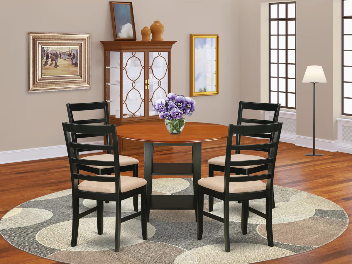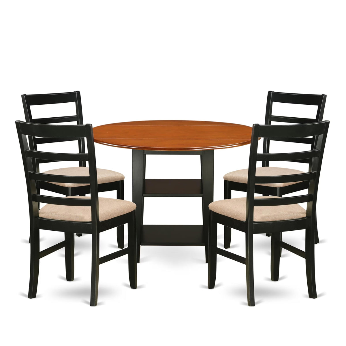 EAST WEST FURNITURE - SUPF5-BCH-C - KITCHEN TABLE SETThis 5-piece kitchen set consists of 4 dining chairs and a kitchen table. The dining table showcases a seamless blend of Cherry table top and a Black Finish Base, offering a timeless aesthetic. Its versatile design complements various home decor styles, ensuring lasting appeal. The dining chairs feature Black finished wooden legs for a touch of contemporary sophistication. They have Linen Fabric seats, Ladder Back, and the modern table includes 2 shelves, a drop leaf round top, and 4 legs. Crafted from high-quality Asian wood, Rubber Wood, this set guarantees exceptional toughness and durability. Experienced carpenters meticulously designed this set to add luxury to any dining room. Ideal for infusing sophistication into any kitchen, our dining room table set is perfect for casual home parties or intimate gatherings. It's easy to assemble following the provided instructions, and our top priority is customer satisfaction.PRODUCT FEATURES: Frame Material: Asian Wood Frame Color: Black and Cherry Table Top Style: Round Chair Back Style: Ladder Seat Material: Linen Fabric Chair Dimensions: Length: 22; Width: 18; Height: 38. Table Dimensions: Length: 42; Width: 42; Height: 29.5.Included in the Package: 4 Modern Dining Chairs and a Dinner Table.