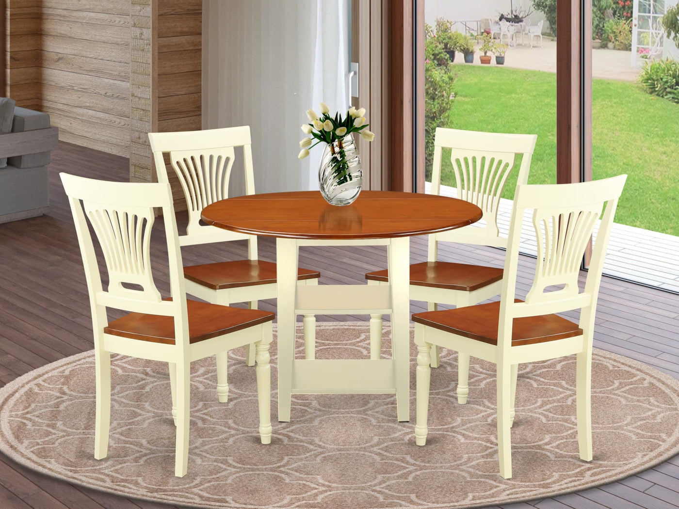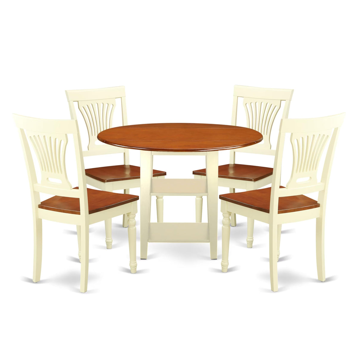 EAST WEST FURNITURE - SUPL5-BMK-W - MODERN DINING TABLE SETThis 5-piece kitchen ensemble comprises 4 kitchen chairs and a dining table, blending a cherry tabletop with Buttermilk legs. The Drop Leaf Round wood dining table harmonizes flawlessly with kitchen chairs sporting cherry seats and Buttermilk legs. These dining chairs provide a chic departure from conventional options and seamlessly enhance any decor, adding elegance to your space. They feature Wooden Seats, Slatted Backs, and the kitchen table has 2 shelves, a drop-leaf round top, and 4 legs. Crafted from top-tier Asian rubberwood, our dining table set guarantees unmatched durability due to its solid rubberwood construction, avoiding heat-treated wood, plywood, veneer, or laminated materials. Its versatile style will effortlessly complement your home decor for years to come. We've had highly experienced carpenters ensure a smooth and high-end finish for this dining room table set. Ideal for any dining area, this premium-quality modern dining table set is perfect for casual home gatherings. We prioritize innovation and ease of assembly, offering clear instructions for hassle-free setup. Rest assured, your satisfaction is our top priority when you purchase our products!PRODUCT FEATURES: Frame Material: Asian Wood Frame Color: Buttermilk and Cherry Table Top Style: Round Chair Back Style: Slatted Seat Material: Wood Chair Dimensions: Length: 22; Width: 18; Height: 37. Table Dimensions: Length: 42; Width: 42; Height: 29.5.Included in the Package: 4 Dinning Room Chairs and a Dinner Table.
