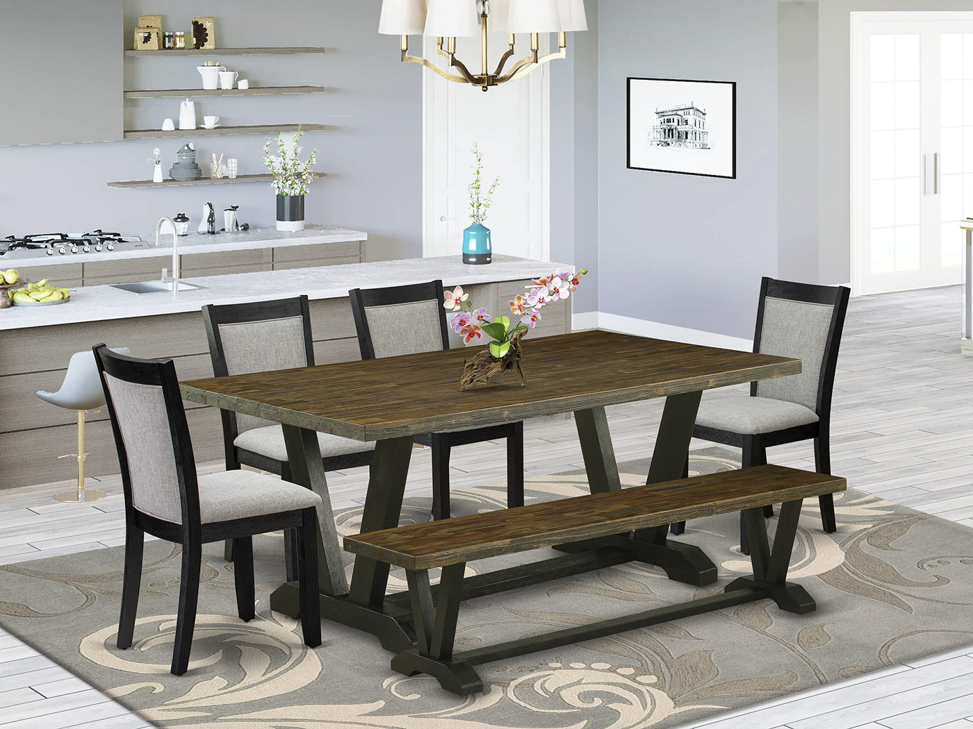 EAST WEST FURNITURE - V677MZ606-6 - 6 PIECE DINING TABLE SETThis 6-piece dining room set includes a wooden dining table, a mid-century modern bench, and 4 matching dining room chairs to enhance both comfort and the dining room's contemporary ambiance. With its distressed Jacobean tabletop and Wire Brushed Black finish, the dining table and bench offer a refined aesthetic. The wood dining chairs feature the same Wire Brushed Black finish and Shitake linen fabric, blending versatility with elegance. The frame, made of prime quality Rubber Wood, guarantees durability and stability. These upholstered dining chairs, subtly curved and expertly finished, offer comfortable seating with their soft linen fabric and strong spring elasticity. The wide seats ensure comfort. Linen Fabric dining chairs also add stylish intrigue to your dining room. This dining table set is easy to clean with a damp cloth and straightforward to assemble. Each set arrives flat packed with clear instructions and necessary tools for quick assembly. You'll appreciate the quality, style, and affordability of our kitchen table set.DINING ROOM SET FEATURES: Wood Material: Rubber Wood Fabric Material: Linen Fabric Chair Back Style: Upholstered High Back Dinning Table Top Color: Distressed Jacobean Small Wood Bench Top Color: Distressed Jacobean Parson Chairs Fabric Color: Shitake Kitchen Table Legs Color: Wire Brushed Black Bench for Dining Room Table Legs Color: Wire Brushed Black Kitchen Chairs Finish: Wire Brushed Black Dimensions of Dining Table: Length: 72; Width: 40; Height: 30. Bench for Dining Room Table dimensions: Length: 72; Width: 15; Height: 18. Dimensions of Wooden Dining Chairs: Length: 19.5; Width: 17.7; Height: 36.8.Include in this Modern Dining Table Set - 4 Dinning Chairs, 1 Dining Room Bench, and 1 Modern Kitchen Table.