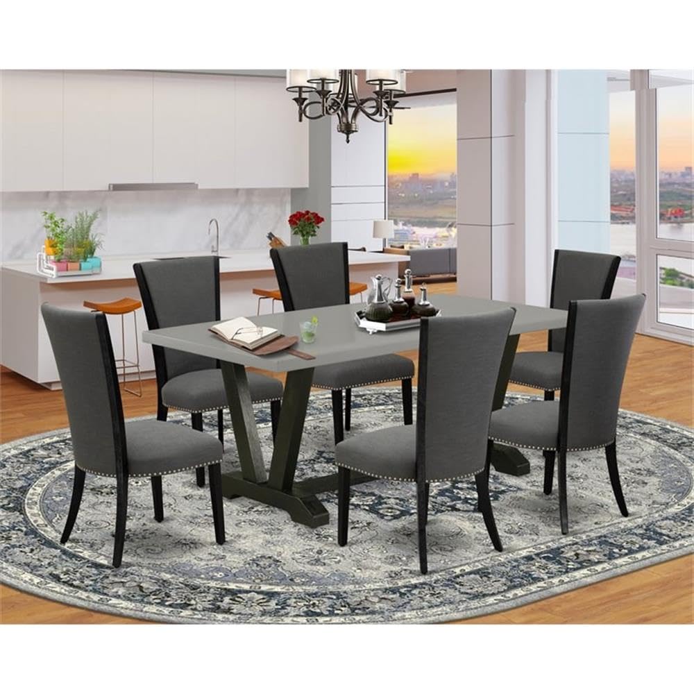 East West Furniture - V697VE650-7 - 7-Piece Dining Table Set: Our kitchen table set adds a touch of elegance to any dining room that you and your family will absolutely enjoy. The elegant 7 Piece modern dining table set contains a wood table and 6 parson dining chairs. This rectangular kitchen table top is offered in a Cement finish. In addition, the upholstered dining chairs in a Dark Gotham Grey Linen Fabric enhance the elegance of any home. Ideal for dinette, kitchen and dining areas, this multi-functional table set seats up to 6 people, perfect for families to enjoy mealtimes together. A great addition to your dining area and a perfect ensemble that will strike your guests with its best impression. We have created these Dark Gotham Grey finish kitchen chairs and mid century modern dining table with the help of highly experienced carpenters, who generate a smooth and high-end finish to this dining room set. Upholstered chairs of the dinette set can be moved under the dining room table when you finish your meal, which our kitchen dining table set largely helps you save room space. Designed with easy and fast assembly in mind, each set comes conveniently flat packed with easy-to-follow instructions and all necessary tools included. Our premium quality dining set is perfect for you and your dining area as well as the kitchen area. Our table set is quite simple to clean and always offers a great appeal. The dining room set adds a refined touch to even your most casual family dinners. Keep Enjoy With East West Furniture!Features:Includes: A dining room table and 6 parson chairs.Material: Rubberwood, linen fabricFinish: Dark gotham gray, cement, black7-piece dinette set: Our dining room set includes a modern dining table and 6 matching dining room chairs.Bring modern and sophisticated style to any dining area with our dining room table set.This stunning table set is a shining example of innovative design and forward thinking.A kitchen dining table set is a great thing to upgrade your kitchen or dining room style.Mid century modern dining set finish: We have designed a dinette set with a premium quality finish that produces a beautiful appearance to any dining area.Our dining table has a cement finish rectangular table top and wire brushed black wooden v-style legs.The modern chairs have included a dark gotham grey linen fabric seat and black finish wooden 4 legs.Our dinner table and upholstered chairs finish combination is matched with any room decor.Solid wood structure: This dining set is created from good quality Asian wood material known as rubberwood.Our dinner table set durability is unmatched thanks to this superior quality material that is used during manufacturing.No heat-treated wood, plywood, veneer or laminated wood has been used to construct this dining room set.Its versatile style will complement just about any decor in your home for many years to come.Dining chairs material: These dining chairs provide an elegant touch to your dining area with linen fabric seat and high chair back.The seat and backrest of the upholstered dining chairs are made of premium quality linen fabric.The linen fabric modern dining chairs will provide a touch of beauty to any home with a contemporary appearance.Our soft cushion and backrest make these dining chairs a pleasant sitting feeling.Dining chair back style: High back.Specifications:Table Dimensions: 30"H x 40"W x 72"DDining Chair Dimensions: 39"H x 25"W x 20"DProduct Weight: (Table) 117 lbs; (Chair) 35 lbsChair Weight Capacity: 300