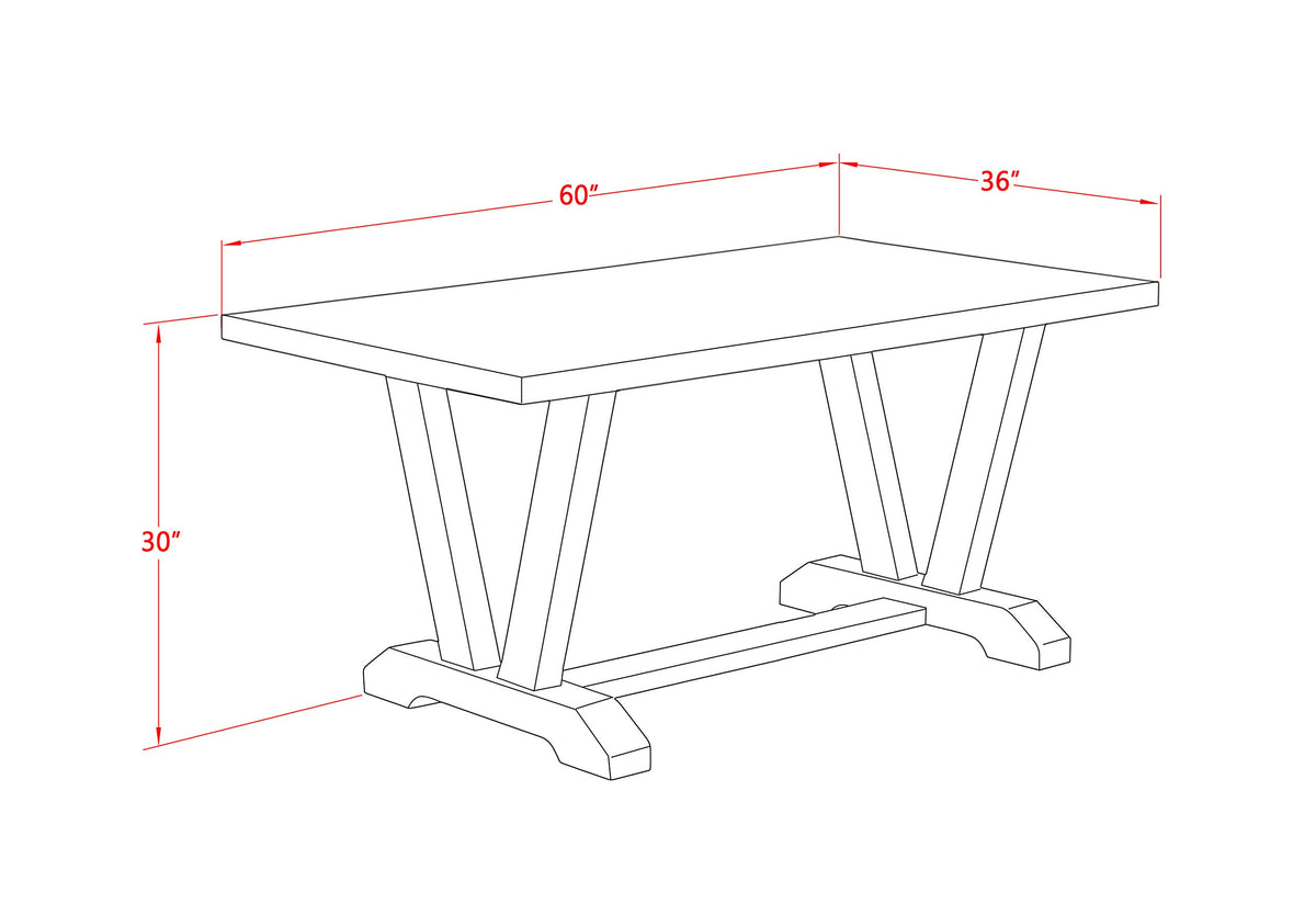 EAST WEST FURNITURE - V2-676 - 3-PIECE KITCHEN TABLE SETThis Innovative 3 Pc dining room set is consisting of 1 rectangular dinning table and 2 matching wooden benches. This Distressed Jacobean kitchen table makes its appearance more attractive. Our dining room bench adds a sense of magnificence and also the contemporary design is compatible seamlessly with any dining decor. The rectangular tabletop is created from high-quality Rubber Wood material that helps for heightened durability and long-lasting use. This contemporary, budget-friendly, durable, and comfortable dining set can be a wonderful choice if you are appearing for a great eating time experience with family and friends. Fabulous fixed tabletop design, good quality colors, and robust premium hardwood made it the best breakfast table for your dining area and supply perfect stability to this small dining table. Simplistic and easy-to-move design is full of magnificence and charm. Its perfect dimensions are suitable for most dining rooms, don’t hesitate to bring it home and enjoy it.PRODUCT FEATURES: Material Type: Asian Wood Wood Table Top Color: Distressed Jacobean Wood Dining Table and Modern Bench Legs Color: Wire Brushed Black Dimensions of Wood Table: Length: 60; Width: 36; Height: 30. Dining Room Bench Dimensions: Length: 60, Width: 15, Height: 18.Include in this Package: 1 Small Dining Table and 2 Dining Benches.