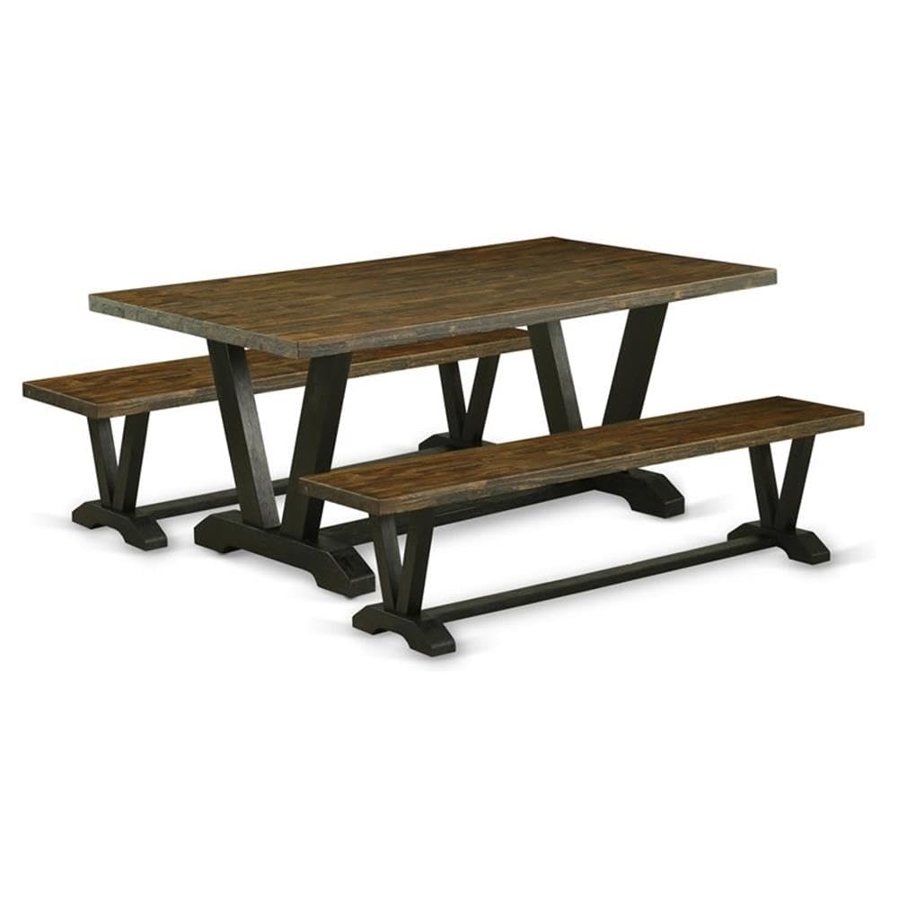EAST WEST FURNITURE - V2-677 - 3-PIECE kitchen SETIntroducing our innovative 3-piece table set, comprised of a single rectangular dining table and 2 matching wooden benches. The Wire Brushed Black finish on the dining table enhances its visual appeal. Our compact wooden bench exudes elegance, boasting a contemporary design that seamlessly complements any dining decor. Crafted from high-quality rubber wood material, the distressed Jacobean tabletop offers exceptional durability and long-lasting performance. This contemporary, budget-friendly, sturdy, and comfortable small dining table set is the ideal choice for those seeking a memorable dining experience with family and friends. With its fabulous fixed tabletop design, a range of premium color options, and robust construction from top-notch hardwood, it serves as the perfect addition to your dining area, ensuring stability for your dining needs. Its simplistic and easy-to-move design radiates charm and allure, making it a versatile and captivating piece. Featuring perfect dimensions that fit most dining rooms, don't hesitate to bring this set home and indulge in its charm and functionality.PRODUCT FEATURES: Material Type: Asian Wood Dinning Table Top Color: Distressed Jacobean Dining Room Table and Small Bench Legs Color: Wire Brushed Black Dimensions of Wood Dining Table: Length: 72; Width: 40; Height: 30. Bench for Dining Room Table Dimensions: Length: 72; Width: 15; Height: 18.Include in this Package: 1 Dining Table and 2 Benches for Dining Room Table.
