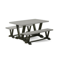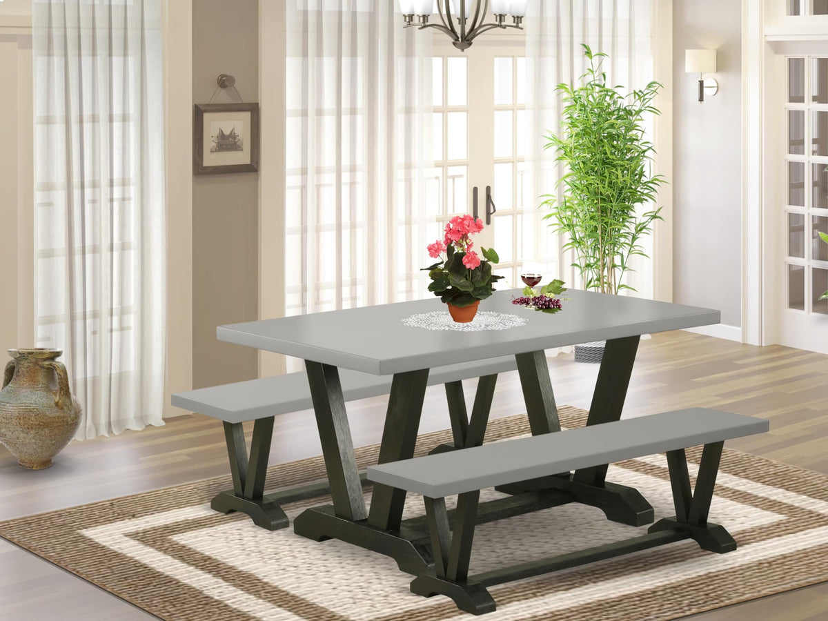 EAST WEST FURNITURE - V2-696 - 3-PIECE MODERN DINING TABLE SETThis Sophisticated 3 Pc dinette set is consisting of 1 rectangular dinning table and 2 matching modern benches. This Cement breakfast table makes its appeal more attractive. Our dining bench adds a sense of elegance and the modern design is compatible seamlessly with any kitchen decor. The Spacious tabletop is created from excellent quality Rubber Wood material that helps for heightened durability and long-lasting use. This contemporary, budget-friendly, durable, and comfortable table set can be a wonderful choice if you are appearing for a great dining time experience with family and friends. Fabulous fixed tabletop design, good quality colors, and robust premium hardwood made it the ideal dinner table for your kitchen area and supply perfect stability to this modern dining table. Simplistic and easy-to-move design is full of elegance and attraction. Its perfect dimensions are suitable for most dining rooms, don’t hesitate to bring it home and enjoy it.TABLE SET FEATURES: Material Type: Asian Wood Dining Table Top Color: Cement Small Dining Table and Table Bench Legs Color: Wire Brushed Black Dimensions of Dining Table: Length: 60; Width: 36; Height: 30. Kitchen Bench Dimensions: Length: 60, Width: 15, Height: 18.Include in this Package: 1 Kitchen Table and 2 Wood Benches.