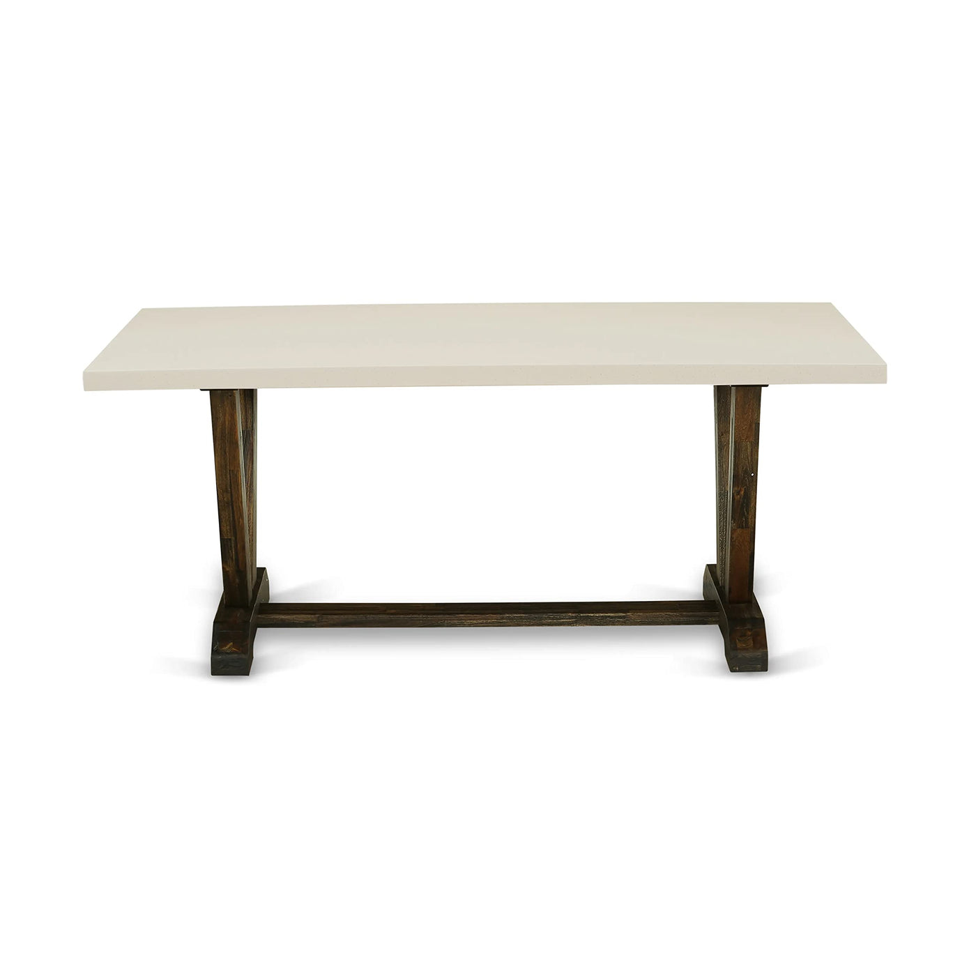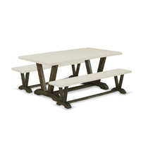 EAST WEST FURNITURE - V2-727 - 3-PIECE KITCHEN DINING TABLE SETThe innovative 3-piece dining room table set comprises a rectangular small dining table and 2 matching mid-century modern benches. The Linen White on the dining tabletop and Distressed Jacobean enhances its visual appeal. Our dining room bench adds an element of elegance, seamlessly blending with any kitchen decor thanks to its modern design. The spacious tabletop is crafted from high-quality Rubber Wood material, ensuring enhanced stability and long-lasting durability. This contemporary, budget-friendly, durable, and comfortable dining room set is an excellent choice if you're looking for a delightful dining experience with family and friends. The design is simple and easy to move, brimming with elegance and charm. Its ideal dimensions make it suitable for most dining rooms, so don't hesitate to bring it home and relish its appeal.PRODUCT FEATURES: Material Type: Asian Wood Dining Table Top Color: Linen White Table and Bench Legs Color: Distressed Jacobean Dimensions of Table: Length: 72; Width: 40; Height: 30. Bench Dimensions: Length: 72; Width: 15; Height: 18.Include in this Package: 1 Breakfast Table and 2 Kitchen Benches.
