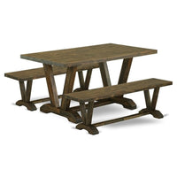 EAST WEST FURNITURE - V2-776 - 3-PIECE DINING SETOur contemporary 3-piece dining set comprises a rectangular dining table and 2 matching kitchen table benches. The small kitchen table and bench top color is Distressed Jacobean with Distressed Jacobean finish legs. The spacious tabletop is crafted from high-quality Rubber Wood material, ensuring exceptional durability and long-lasting performance. This modern dining table set is both contemporary and budget-friendly, making it a durable and comfortable option for delightful dining experiences with family and friends. Its impressive fixed tabletop design, superior color choices, and sturdy premium hardwood construction establish it as the ideal dining table for your dining area, providing impeccable stability. Its ideal size is suitable for most dining rooms, so don't hesitate to bring it home and enjoy its benefits.kitchen SET FEATURES: Material Type: Asian Wood Dining Room Table Top Color: Distressed Jacobean Dining Room Table and Small Wood Bench Legs Color: Distressed Jacobean Dimensions of Wood Table: Length: 60; Width: 36; Height: 30. Dining Table Bench Dimensions: Length: 60; Width: 15; Height: 18.Include in this Package: 1 Small Kitchen Table and 2 Small Wood Benches.