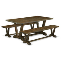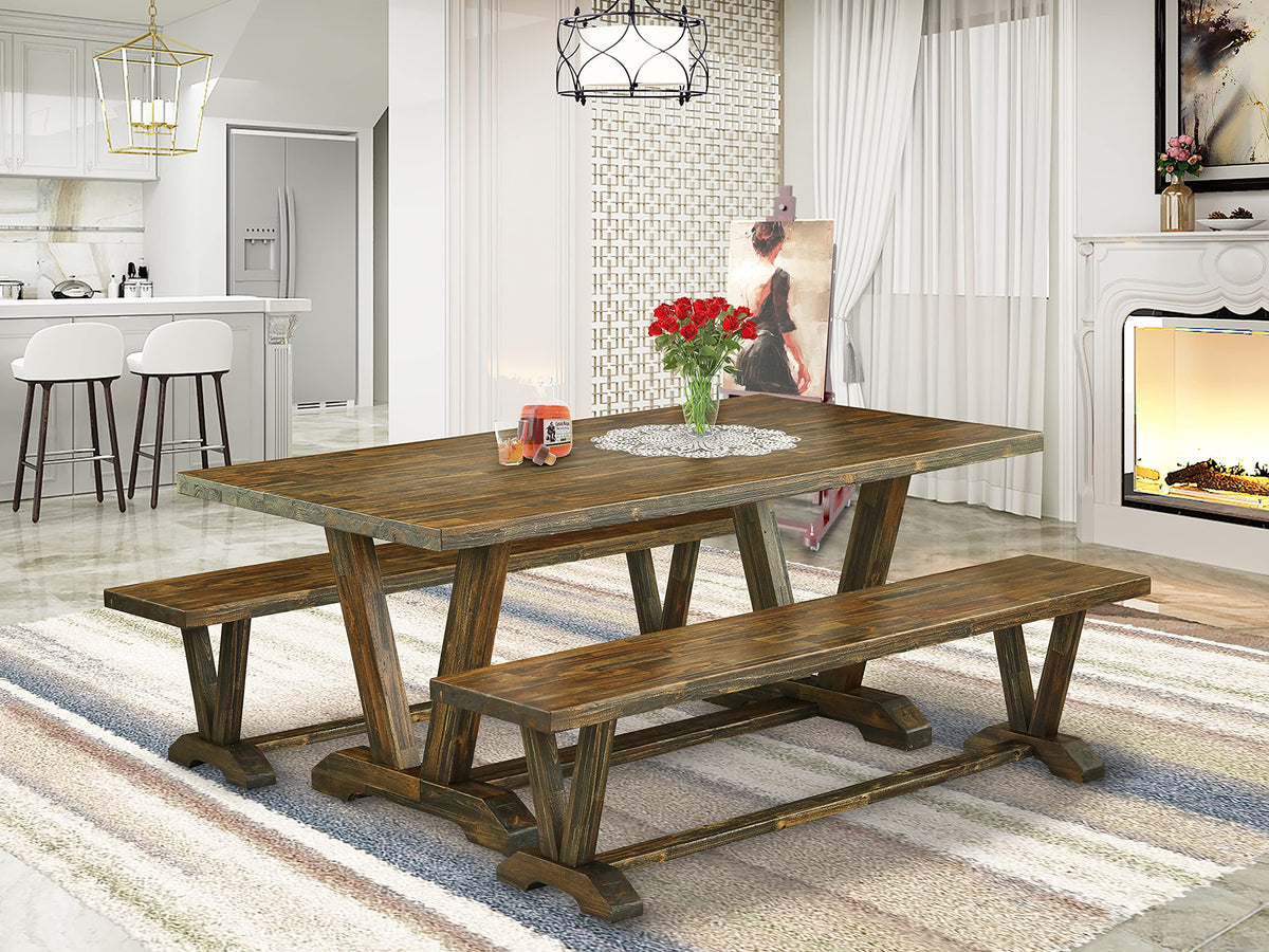 EAST WEST FURNITURE - V2-777 - 3-PIECE Small Dining Table SetOur modern 3-piece dining room table set includes a rectangular small kitchen table and 2 matching kitchen benches. The kitchen table and bench top are adorned in Distressed Jacobean color with matching Distressed Jacobean finish legs. The spacious tabletop is crafted from high-quality Rubber Wood material, ensuring excellent stability and long-lasting durability. If you're looking for an affordable, durable, and comfortable kitchen set to enhance your dining experience with family and friends, this contemporary option is an excellent choice. The fixed tabletop design is both fabulous and practical, with high-quality color finishes and sturdy premium hardwood construction that make it the ideal dining room table for your kitchen area, providing exceptional stability. Its simplistic and easy-to-move design exudes elegance and charm, and its perfect size fits well in most dining rooms. Don't hesitate to bring it home and enjoy it.DINING TABLE SET FEATURES Material Type: Asian Wood Small Dining Table Top Color: Distressed Jacobean Table and Bench Legs Color: Distressed Jacobean Dimensions of Table: Length: 72; Width: 40; Height: 30. Bench Dimensions: Length: 72; Width: 15; Height: 18.Include in this Package: 1 Dinner Table and 2 Dining Benches.
