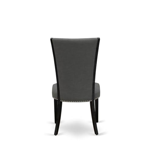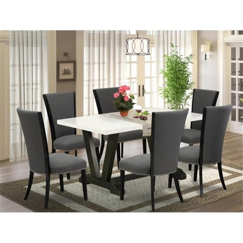 EAST WEST FURNITURE - V626VE650-7 - 7 PIECE MID CENTURY DINING SETOur kitchen dining table set adds a touch of elegance to any dining room that you and your family will absolutely enjoy. The elegant 7 Piece kitchen table set contains a modern table and 6 dining room chairs. This rectangular dining table top is offered in a Linen White finish. In addition, the dining room chairs in a Dark Gotham Grey Linen Fabric enhance the elegance of any home. Ideal for dinette, kitchen and dining areas, this multi-functional kitchen table set seats up to 6 people, perfect for families to enjoy mealtimes together. A great addition to your dining area and a perfect ensemble that will strike your guests with its best impression. We have created these Dark Gotham Grey finish kitchen chairs and modern table with the help of highly experienced carpenters, who generate a smooth and high-end finish to this kitchen table set. Dining chairs of the dinner table set can be moved under the dining room table when you finish your meal, which our dinette set largely helps you save room space. Designed with easy and fast assembly in mind, each set comes conveniently flat packed with easy-to-follow instructions and all necessary tools included. Our good quality dinner table set is perfect for you and your dining area as well as the kitchen area. Our table set is quite simple to clean and always provides a good appeal. The mid century dining set adds a refined touch to even your most casual family dinners. Keep Enjoy With East West Furniture!DINING ROOM SET FEATURES:? Wood Material: Rubberwood? Fabric Material: Linen Fabric? Wooden Table Top Color: Linen White? Modern Kitchen Table Legs Color: Wire Brushed Black? Upholstered Dining Chair Fabric Color: Dark Gotham Grey? Parson Dining Chairs Legs Color: Black? Kitchen Chairs Back Style: High Back? Table Dimensions: Length: 60; Width: 36; Height: 30.? Chair Dimensions: Length: 24.70; Width: