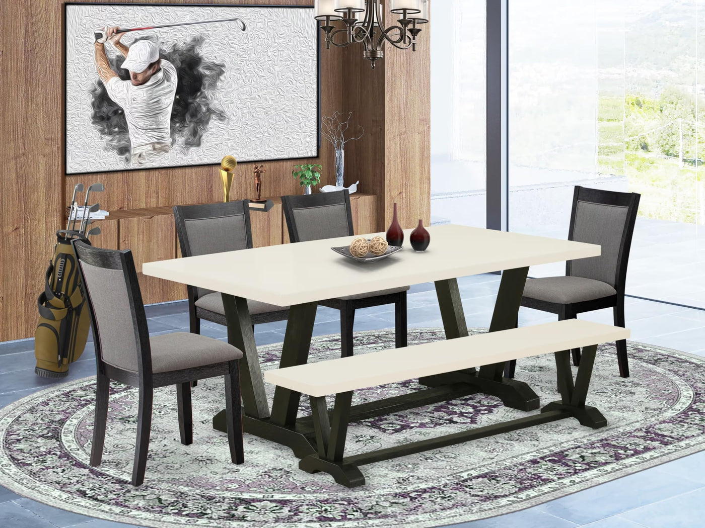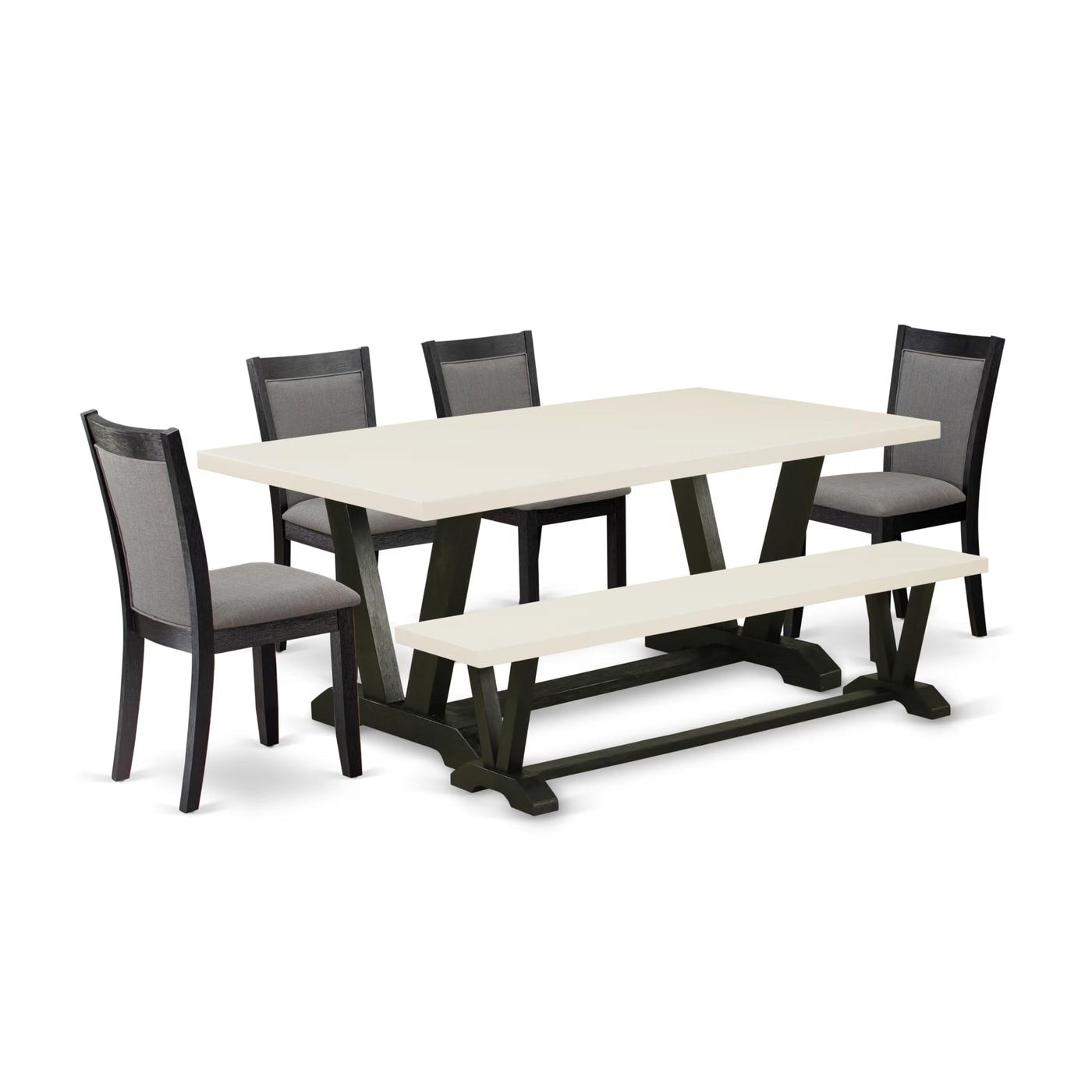 EAST WEST FURNITURE - V627MZ650-6 - 6 PC DINING ROOM TABLE SETThis 6-piece kitchen table set comprises four kitchen chairs, a rectangular dining table, and a sturdy wooden bench. It seamlessly blends modern design elements with timeless aesthetics, evident in every intricate detail. We proudly present a dining room set characterized by its polished and refined appearance, capable of enhancing the contemporary ambiance of any dining space. The modern dining table and dining bench feature a Linen White tabletop with a Wire Brushed Black finish, while the kitchen chairs exude sophistication with their Wire Brushed Black finish and tasteful upholstery in Dark Gotham Grey linen fabric. Our commitment to quality shines through in this meticulously crafted modern dining set, constructed with great care using premium Asian Wood, commonly known as Rubberwood, celebrated for its exceptional durability and strength. The dining set boasts a robust and stable framework, with high-quality legs that not only ensure unwavering stability but also add an element of elegance to your dining experience. Our premium kitchen chairs are designed with upholstered seats and backs to provide enhanced comfort.PRODUCTS FEATURES: Wood Material: Rubberwood Fabric Material: Linen Fabric Chair Back Style: High Back Table Top and bench Color: Linen White Chairs Fabric Color: Dark Gotham Grey Table and bench Legs Color: Wire Brushed Black Chairs Finish: Wire Brushed Black Table Dimensions : Length: 72; Width: 40; Height: 30. Bench dimensions: Length: 72; Width: 15; Height: 18. Chairs Dimensions : Length: 19.5; Width: 17.7; Height: 36.8.Include in this Modern Dining Table Set - 4 Dining Chairs, 1 Dining Bench, and 1 Dinning Table.