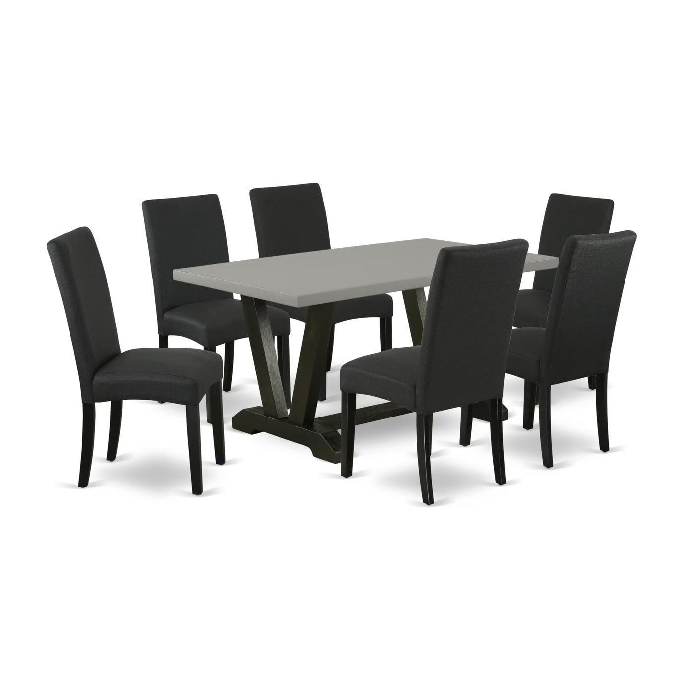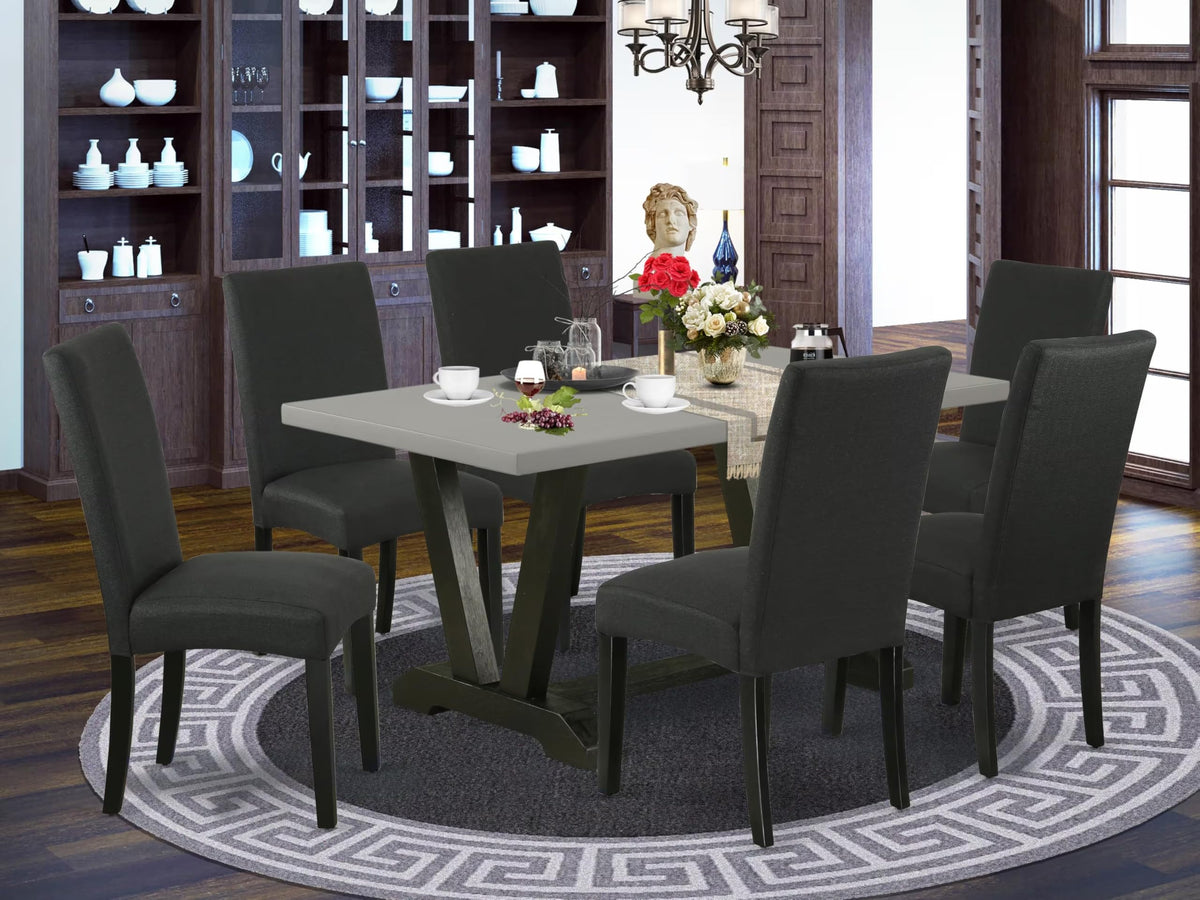 East West Furniture - V696Dr124-7 - 7-Piece Kitchen Dining Setthis 7-Piece Dining Room Table Set Includes A Dining Table And 6 Parson Dining Chairs. The Dining Table Features A Cement Rectangular Top Complemented By Sleek Black Wire-Brushed Wooden Legs, While The Parson Chairs Showcase A Black-Finished Frame And Stylish Black Chair Backs. This Combination Effortlessly Complements Various Room Decor Styles. Crafted From Premium Asian Wood, The Parson Dining Room Chairs And Breakfast Table Exhibit Exceptional Quality, With Solid Wood Frames Supporting Over 300 Lbs. Assembling This Set Is A Straightforward Process, Thanks To Clear Instructions. The Parson Dining Chairs Come With Linen Fabric Seats And Elegant Chair Backs, And The Rectangular Table Features A Wooden Top And Legs. Cleaning Is A Breeze Just Use A Damp Cloth To Remove Dust. Whether For Your Dining Room Or Kitchen, These Dining Room Chairs And The Wooden Dining Table Make An Excellent Choice, Boasting A Modern Design And Straightforward Assembly With Uniform-Sized Screws.Product Features: Material: Asian Hardwood Seating Material: Linen Fabric Table Top Color: Cement Table Legs Color: Wire Brushed Black Chairs Legs Color: Black Chairs Fabric Color: Black Dining Table Dimensions: Length: 60; Width: 36; Height: 30. Kitchen Chairs Dimensions: Length: 24.2; Width: 19.2; Height: 39.Included In The Package: A Kitchen Dining Table And 6 Parson Chairs