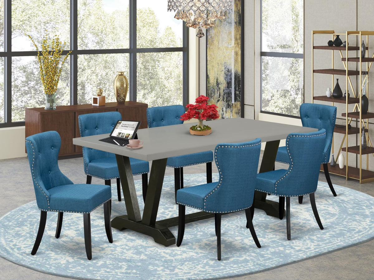 East West Furniture - V697Si121-7 - 7-Pc Kitchen Dining Seta Refined Dining Arrangement Consists Of A Rectangular Table And Six Exquisite Mid-Century Dining Chairs, Adding To The Charm Of Your Dining Area. This Seven-Piece Dining Set Introduces A Modern And Distinctively Beautiful Aesthetic With Its Sleek Tabletop And Comfortable Seating. Its Adaptable Design Effortlessly Complements Various Interior Styles, Ensuring Timeless Elegance In Your Home For Years To Come. This Kitchen Furniture Ensemble Combines Sophisticated Elements, Including A Cement Rectangular Tabletop With Wire Brushed Black Wooden Legs. Our Kitchen Parson Chairs Have Black-Finished Frames And Are Upholstered In Linen Fabric, Featuring A Striking Blue Button Tufted Chair Back. These Parson Dining Chairs Are Known For Their Button-Tufted Chair Back And Are Expertly Crafted With A Wooden Frame. The Chairs' Frames Are Constructed From High-Quality Asian Wood, Ensuring Exceptional Strength And Durability. Additionally, The Chairs Have Low-Maintenance Seats, Making Them Perfect For Everyday Use In A Professional Dining Setting. The Rectangular Breakfast Table Showcases An Elegant Design, Featuring A Rectangular Top Supported By Robust Wooden Legs. The Dining Chairs Provide Exceptional Comfort With Their Linen Fabric Seats, Button Tufted Chair Backs, And Sturdy Frames. This Distinctive Dining Table Set Exudes Timeless Sophistication, Seamlessly Fitting Into Any Decor Style.Product Features: Material: Asian Hardwood Seating Material: Linen Fabric Table Top Color: Cement Table Legs Color: Wire Brushed Black Chairs Legs Color: Black Chairs Fabric Color: Blue Table Dimensions: Length: 72; Width: 40; Height: 30. Chairs Dimensions: Length: 21.5; Width: 19.5; Height: 35.5.Included: A Dining Table And 6 Padded Parson Chair.