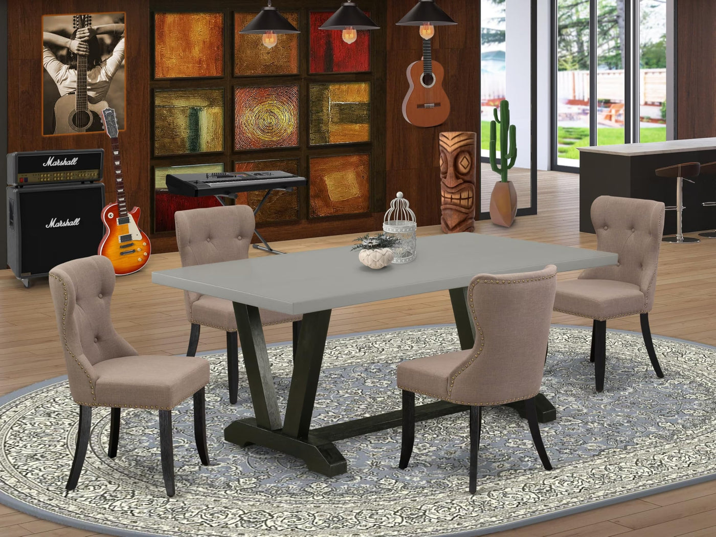 East West Furniture - V697Si648-5 - 5-Piece Dining Room Table Setour 5-Piece Dinette Set Includes 4 Kitchen Chairs And 1 Wooden Dining Table. These Dining Room Chairs Have A Linen Fabric Seat, Button Tufted Chair Back, And The Wooden Dining Table Includes A Rectangular Top And Wooden Legs. The Parson Dining Chairs Seat And The Chair Back Is Made Of Linen Fabric In A Coffee Color Dining Room Chairs Hardwood Frame And The Linen Fabric Seat Is Quite Simple To Clean. You Can Clean Dust Quite Simply And Frequently To Save Time By Using A Damp Cloth. These Parson Dining Chairs And The Dining Table Is The Ideal Choice For Your Dining Room Or Kitchen. A Simple Frame Of The Parson Dining Chairs And The Wood Dining Table As Well As Screws Of The Same Size Allow A Simple And Fast Build.Product Features:Modern Dining Set Material: Asian Hardwoodseating Material: Linen Fabricrectangular Dining Table Top Color: Cementmodern Kitchen Table Legs Color: Wire Brushed Blackkitchen Parson Chairs Legs Color: Wire Brushed Blackparson Dining Room Chairs Fabric: Coffeemodern Rectangular Dining Table Dimensions: Length: 72; Width: 40; Height: 30.Parson Chairs Dimensions: Length: 21.5; Width: 19.5; Height: 35.5Included In The Package: The Modern Dining Room Table And 4 Parson Chairs.