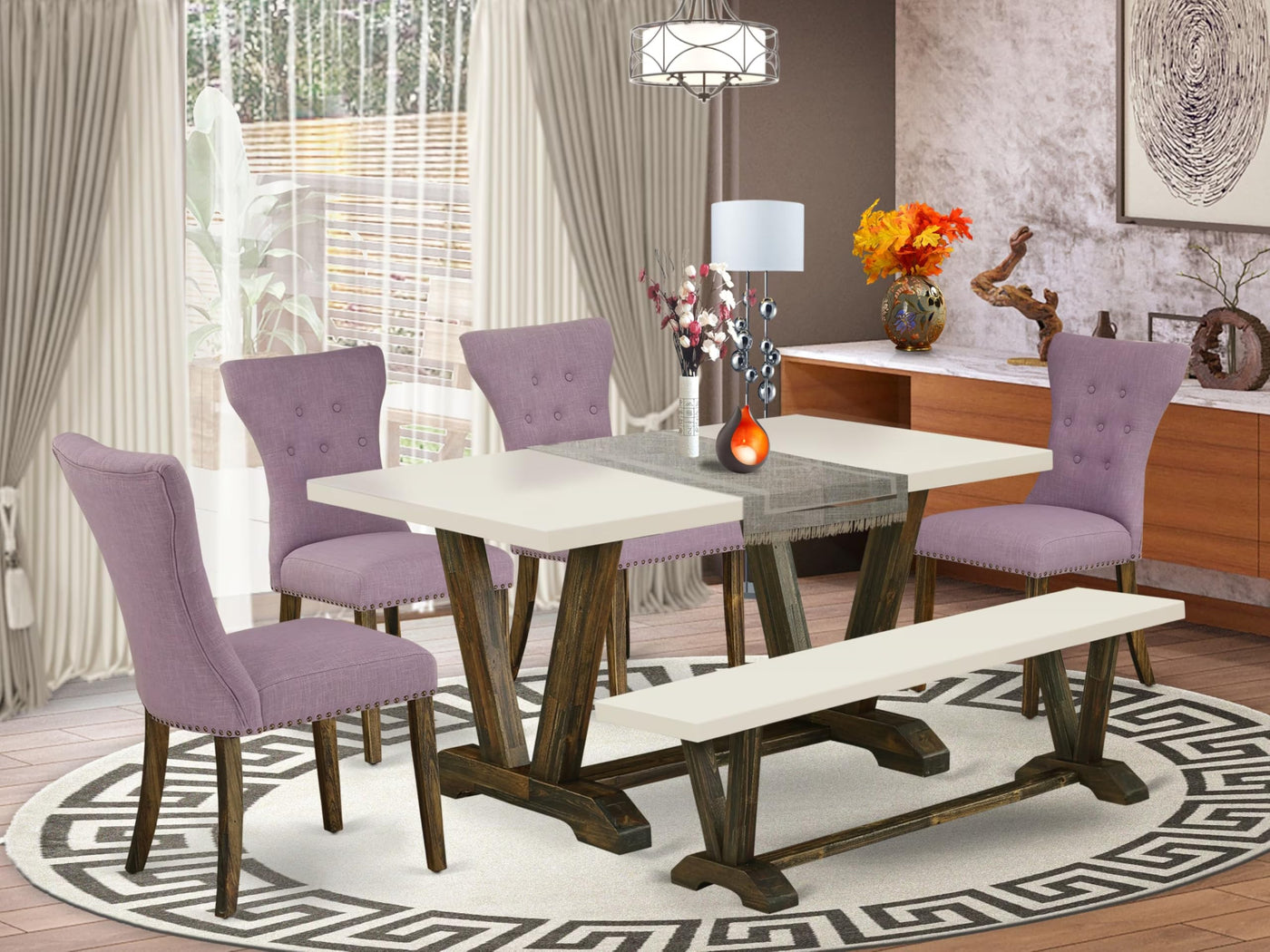 East West Furniture - V726Ga740-6 - 6-Pc Kitchen Setthis Comprises A 6-Piece Kitchen Dining Set Consisting Of A Contemporary Rectangular Dining Table, An Exquisite Kitchen Bench, And 4 Remarkable Kitchen Chairs. The Set Emanates A Modern Vibe, Characterized By Its Sleek, Glossy Finish On The Rectangular Tabletop And Wooden Dining Table. The Rectangular Table Features An Off-White Top With Distressed Jacobean Wooden Legs, While The Dining Room Chairs Boast A Distressed Jacobean Frame Finish, Linen Fabric Seats, And Dahlia Button Tufted Chair Backs. The Kitchen Bench Shares The Same Off-White Color With Distressed Jacobean Legs, Making It A Versatile Choice That Effortlessly Complements A Variety Of Room Decor Styles. Our Parson Dining Chairs Offer A Perfect Blend Of Elegance And Comfort, With Tastefully Button-Tufted Chair Backs. Crafted From High-Quality Asian Wood, These Chairs Provide Robust Stability For Both The Kitchen Table And Dining Bench. Moreover, Their Seats Are Designed For User-Friendliness, Requiring Minimal Maintenance For Everyday Use. In Our Dining Area, You'Ll Find A Rectangular Dining Table And A Kitchen Bench, Both Supported By Sturdy Wooden Legs. Our Dining Room Chairs Are Thoughtfully Designed To Ensure Maximum Comfort, Featuring Linen Fabric Seats, Button Tufted Chair Backs, And A Robust Construction.Product Features: Material: Asian Hardwood Seating Material: Linen Fabric Table And Bench Top Color: Off-White Table And Bench Legs Color: Distressed Jacobean Chairs Legs Color: Distressed Jacobean Chairs Fabric Color: Dahlia Table Dimensions: Length: 60; Width: 36; Height: 30. Chairs Dimensions: Length: 23; Width: 18; Height: 36. Bench Dimensions: Length: 60; Width: 15; Height: 18.Included In The Package: A Dining Table, A Dining Room Bench And 4 Dining Chairs.