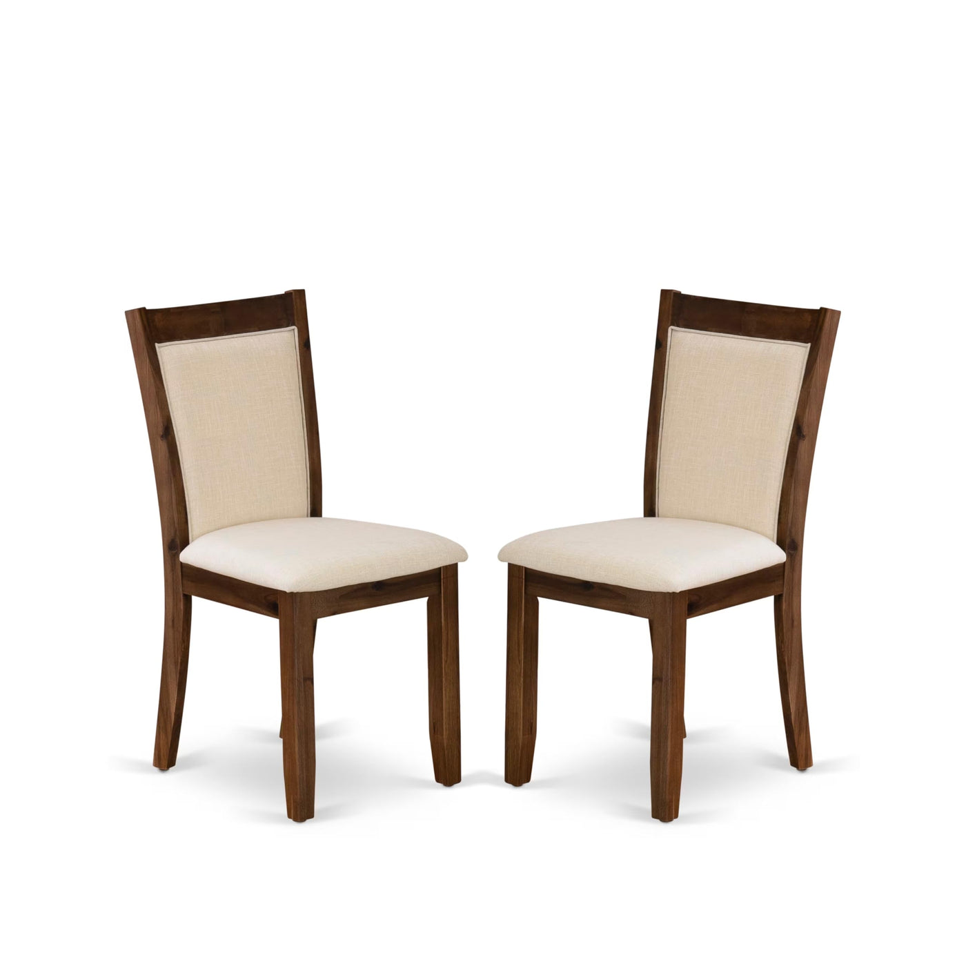 DINING ROOM TABLE SET: This sophisticated 5-piece dining room table set comprises a beautifully crafted small dining table and 4 stunning dining chairs. It is impeccably suited for enhancing the aesthetics of any dining area. These chairs offer a harmonious blend of plush comfort and long-lasting durability, ensuring their enduring appeal over the years. With its modern design, this kitchen set seamlessly complements the decor of any dining room. | DINING ROOM TABLE SET FINISH: This modern dining table is distinguished by its exquisite Linen White top and expertly applied Distressed Jacobean finish. The classical Light Beige Linen Fabric seats, adorned with stylish back designs on the mid-century dining chairs, contribute to a visually stunning appearance in any dining area. Our kitchen table set is a versatile and sophisticated addition, suitable for a wide range of dining rooms and kitchen spaces. | PREMIUM QUALITY MATERIAL: The dining room ensemble is meticulously fashioned from premium-quality Asian Wood Material, also recognized as Rubberwood. This kitchen set is masterfully engineered boasting an Asian solid wood frame that guarantees remarkable stability, capable of accommodating weights of up to 300 lbs. The sophisticated chair back and understated seat design lend an air of refinement to your contemporary dining area. | MODERN DINING CHAIR SEAT MATERIAL: Our classic Linen Fabric kitchen chairs effortlessly introduce an element of refinement to your dining space. With their linen fabric color and sleek design these chairs exude a modern charm. These comfortable dining chairs seamlessly blend with various interior styles, enhancing the overall appeal of any room while ensuring a warm and inviting atmosphere. | PRODUCT DIMENSIONS: Dimensions of the kitchen and dining room table are: Length: 60; Width: 36; Height: 30. The Dimension of Wonderful Upholstered dining chair are: Length: 19.5; Width: 17.7; Height: 36.8. This hardwood 5 Pc Modern Dining Table Set with dining chairs ensures comfort and sturdiness and offers decent support to your back. These high-class padded dining room chairs are fantastic for any dining area in addition to increasing the gorgeousness and comfort of your family. | This Dining Set arrives in 5 boxes. One box for the tabletop, two for the table base and 2 boxes for the chairs.