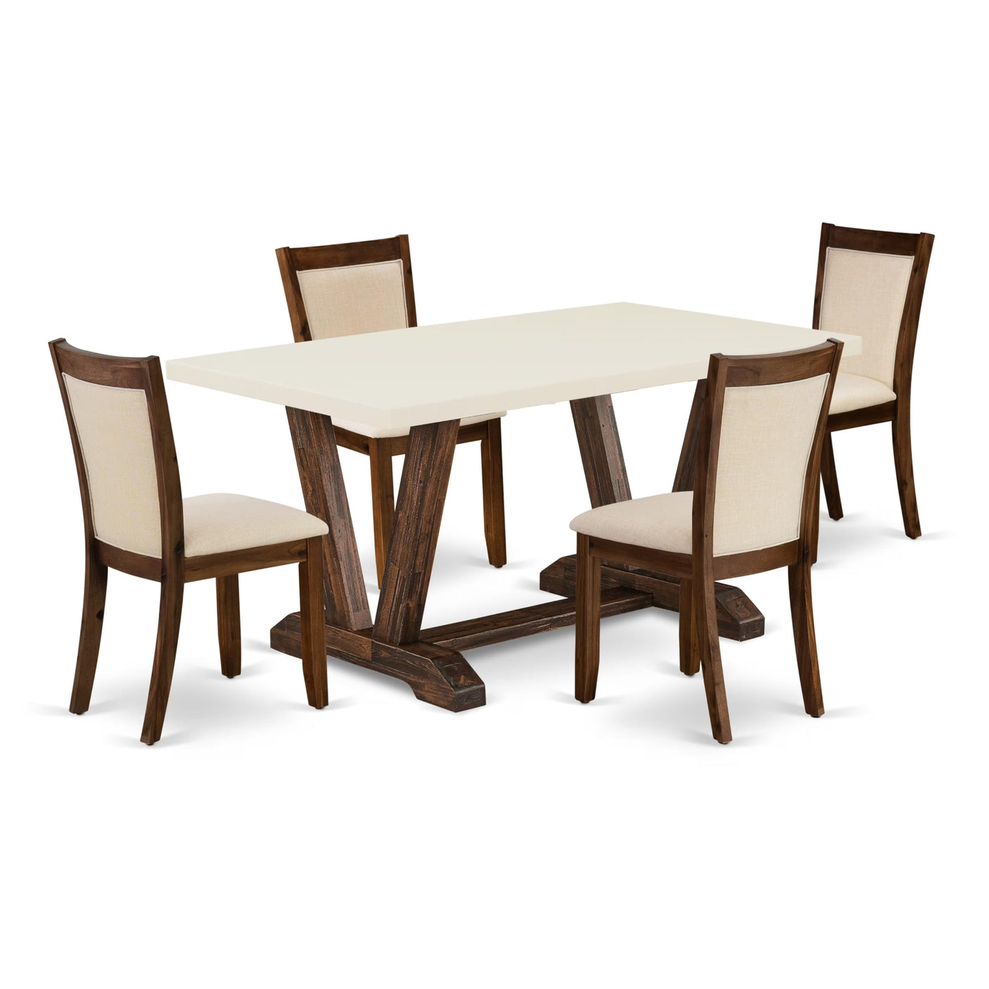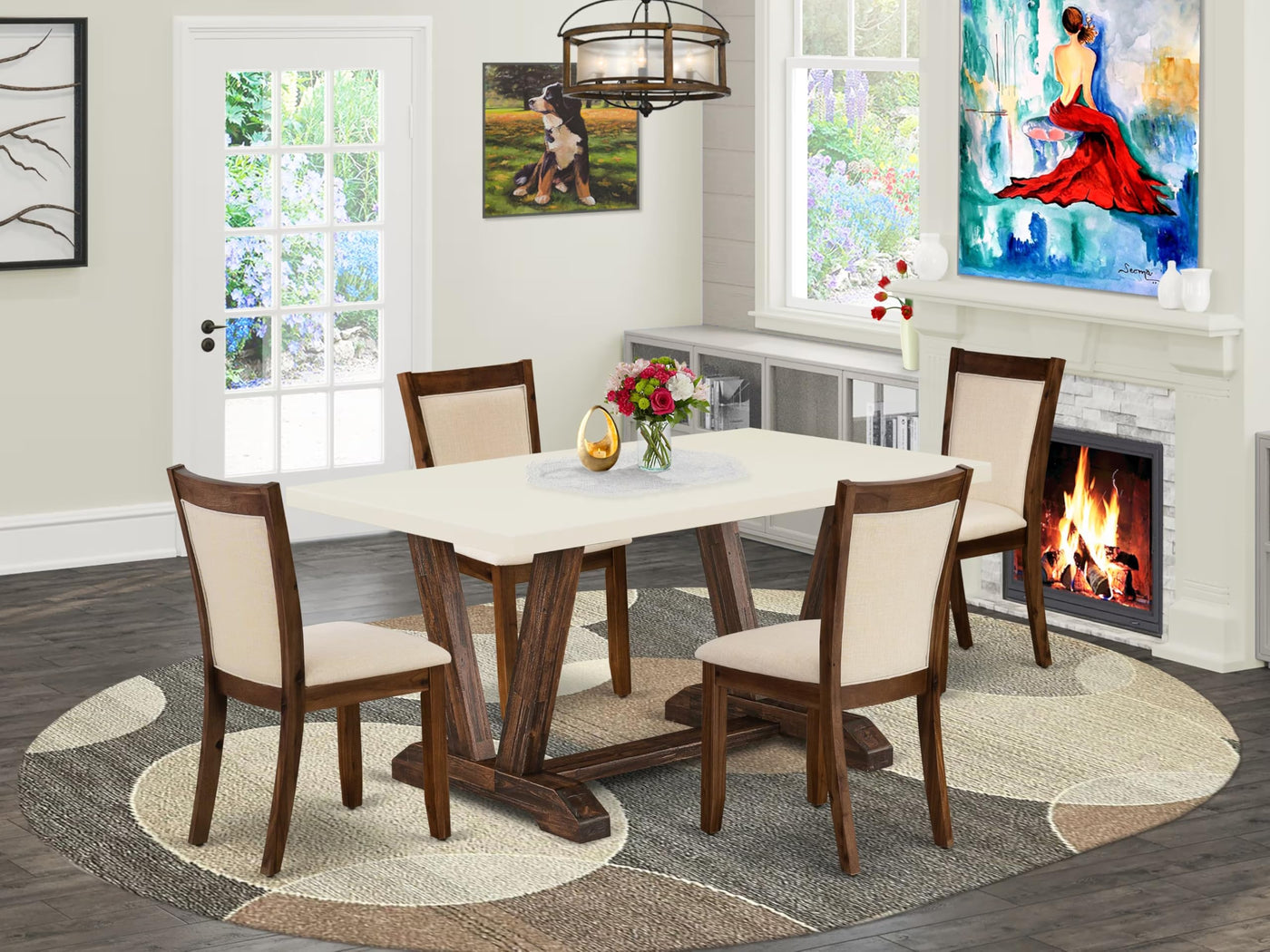 East West Furniture V726Mzn32-5 5 Piece Dining Table Set Includes A Rectangle Kitchen Table With V-Legs And 4 Light Beige Linen Fabric Parson Dining Room Chairs, 36X60 Inch, Multi-Color