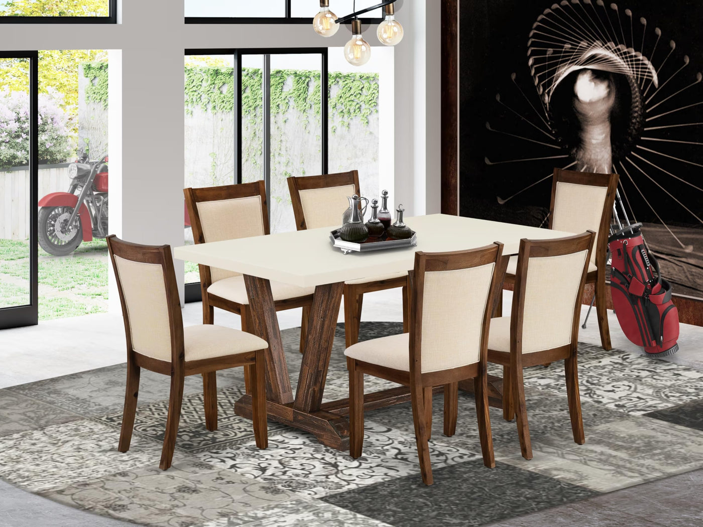 EAST WEST FURNITURE - V726MZN32-7 - 7-Pc KITCHEN DINING SETOur modern dining table set includes 1 modern dining table and 6 wood dining chairs. This modern wooden dining table has a rectangular tabletop and gorgeous wooden legs. The hardwood frame and softly padded seat and back ensure that these padded dining chairs sturdiness and offer suitable support to your back. In addition to their ideal size, these Urban Style dining room chairs are trouble-free to build and easy to rearrange. These straightforward but pleasant Upholstered wood chairs will add ambiance and style to your dining room. Offer your home a pop of chic style with this must-have kitchen table set. The latest twist on a classic design, this eye-catching kitchen table set design will liven up any timeless appeal. You can effortlessly refresh your dining space with this dining table set. This dinner table set is easy to assemble. You only need around 1 hour to build this dining room set. This dining room table set comes with all the necessary hardware to construct this dining room. These dining chairs are easy to carry or move around.PRODUCT FEATURES: Frame Material: Asian Wood Fabric Material: Linen Fabric Table Top Color: Linen White Table Legs Color: Distressed Jacobean Chair Legs Color: Sand Blasting Antique Walnut Cushion Material: Foam Fabric Color: Light Beige Chair Back: Stylish Back Weight Capacity: 300 lbs. Chairs Dimensions are: Length: 19.5; Width: 17; Height: 36.8. Table Dimensions are: Length: 60; Width: 36; Height: 30.Package Included: A Wonderful Mid Century Dining Table and 6 Gorgeous Kitchen Chairs.