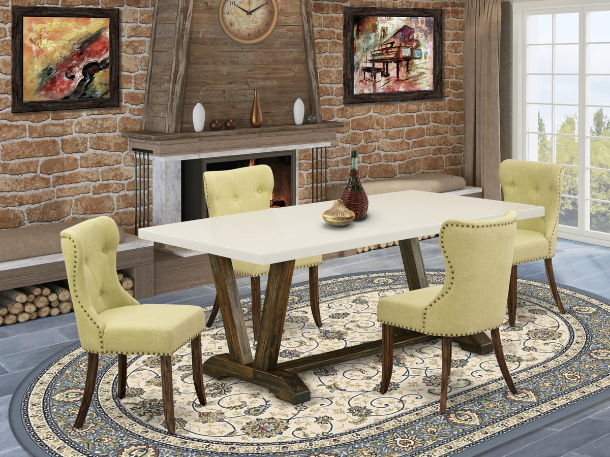 East West Furniture - V727Si737-5 - 5-Piece Modern Dining Table Setthis 5-Piece Kitchen Table Ensemble Comprises 4 Dining Chairs Accompanied By A Contemporary Table. Distinguished By Its Sophisticated Aesthetics, The Table Features An Off-White Rectangular Tabletop And Distressed Jacobean Wooden Legs. The Dining Chairs, Fashioned With A Distressed Jacobean Finish Frame, Showcase A Vibrant Limelight-Colored Fabric And Button Tufted Chair Back, Offering A Harmonious Blend With Various Interior Designs. Crafted From The Durable Rubber Wood, Renowned For Its Resilience, This Mid-Century Dining Set Is An Embodiment Of Stability And Enduring Quality. Its Robust Construction Ensures Steadfast Usage Without Any Unsettling Wobbling. The Dining Chairs Are Equipped With Linen Fabric Seats And Button Tufted Chair Back, Facilitating Effortless Maintenance Through A Simple Wipe-Down With A Damp Cloth. This Meticulously Designed Set Represents An Impeccable Choice For Your Dining Room Or Kitchen. The Assembly Process Is Rendered Straightforward Due To The Consistent Screw Sizes, Enhancing User Convenience And Ensuring A Professional And Aesthetically Pleasing Dining Arrangement.Product Features: Kitchen Room Set Material: Asian Hardwood Seating Material: Linen Fabric Dining Table Top Color: Off-White Dining Table Legs Color: Distressed Jacobean Padded Parson Chair Legs Color: Distressed Jacobean Parson Chairs Fabric Color: Limelight Rectangular Table Dimensions: Length: 72; Width: 40; Height: 30. Kitchen Parson Chairs Dimensions: Length: 21.5; Width: 19.5; Height: 35.5.Included In The Package: One Fantastic Modern Rectangular Dining Table And 4 Awesome Padded Parson Chairs.