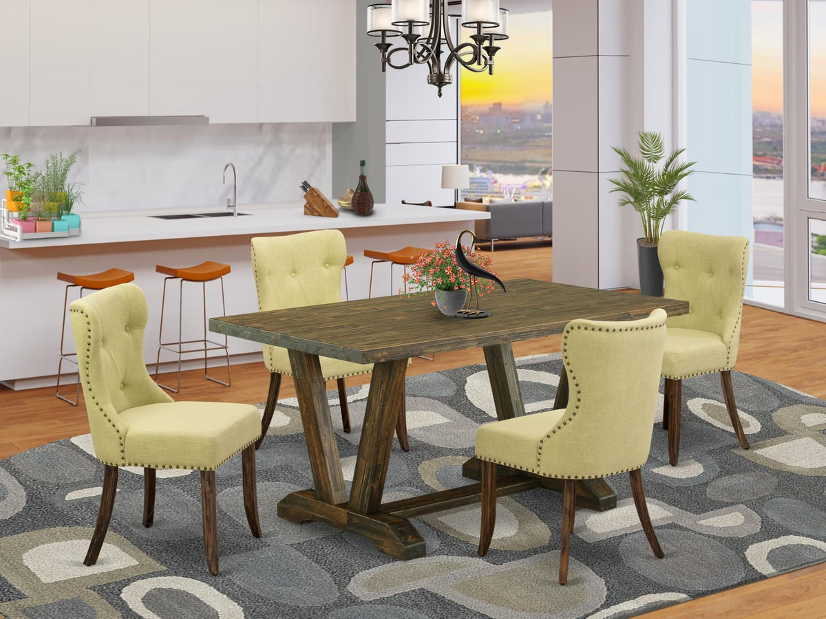 East West Furniture - V776Si737-5 - 5-Piece Kitchen Dining Room Setthis 5-Piece Kitchen Room Table Set Comprises 4 Parson Dining Chairs And A Rectangular Table. The Dining Room Set Features A Charming Distressed Jacobean-Style Rectangular Table Top With Sturdy Wooden Legs. The Parson Chairs Boast Frames Finished In Distressed Jacobean, With Fabric Upholstery And Limelight-Colored Button-Tufted Chair Backs. This Pairing Effortlessly Complements Any Room Decor. Crafted From High-Quality Asian Wood, Especially Rubberwood, This Space-Efficient Kitchen Set Showcases Outstanding Artistry. The Robust Frame, Constructed From Solid Asian Wood, Supports Weights Up To 300 Lbs. The Chairs Have Linen Fabric Seats And Button Tufted Chair Backs, While The Rectangular Table Features A Wooden Top And Wooden Legs. Cleaning Is A Breeze With A Damp Cloth. These Padded Parson Chairs And The Dining Room Table Are Perfect For Your Dining Room Or Kitchen. Their Simple Structure And Uniform Screws Allow For Easy And Fast Assembly.Product Features: Kitchen Table Set Material: Asian Hardwood Seating Material: Linen Fabric Dining Table Top Color: Distressed Jacobean Kitchen Table Legs Color: Distressed Jacobean Parson Dining Chairs Legs Color: Distressed Jacobean Kitchen Chairs Fabric: Limelight Rectangular Table Dimensions: Length: 60; Width: 36; Height: 30. Dining Chairs Dimensions: Length: 21.5; Width: 19.5; Height: 35.5.Included In The Package: A Modern Dining Room Table And 4 Upholstered Dining Chairs.