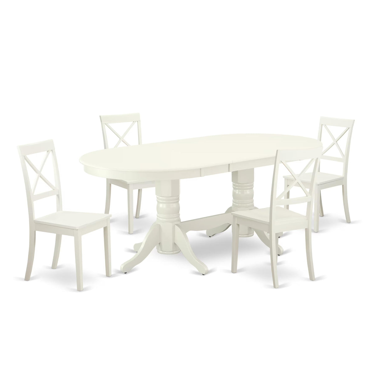 East West Furniture - Vabo5-Lwh-W 5-Piece Dining Table Setour 5-Piece Dining Room Set Comprises A Butterfly Leaf Dining Table And 4 Kitchen Chairs, Combining Practicality With Elegance. This Sophisticated Oval Double-Pedestal Kitchen Table Set Elevates Your Dining Area With Refinement And Comfort, Creating An Ideal Space For Gatherings. The Rectangular Dining Table Boasts A Meticulously Applied Linen White Finish That Seamlessly Extends From The Tabletop To The Linen Whitewood Double Pedestal Legs. This Versatile Design Effortlessly Harmonizes With Various Decor Styles, And It'S Important To Note That No Heat-Treated Wood Is Used. Crafted From Premium-Quality Asian Rubber Wood, Known For Its Durability And Eco-Friendliness, This Dining Set Is Built To Last. The Kitchen Chairs Feature Hardwood Seats And Comfortable Backrests Designed To Conform To The Spine'S Natural Curvature, Ensuring Optimal Comfort During Extended Use. With Its Timeless Shape, Size, And Design, This Contemporary, Budget-Friendly Dining Set Enhances Any Dining Space'S Attractiveness. In Summary, This Durable And Comfortable Dining Set Is An Excellent Choice For Those Seeking A High-Quality Dining Experience With Family And Friends.Product Features: Material: Asian Hardwood Color: Linen White Table Dimensions: Length: 76.3/59; Width: 40; Height: 30. Chair Dimensions: Length: 21; Width: 18; Height: 38. Weight Capacity: 300 Lbs.Includes: 1 Oval Table And 4 Wooden Chairs.