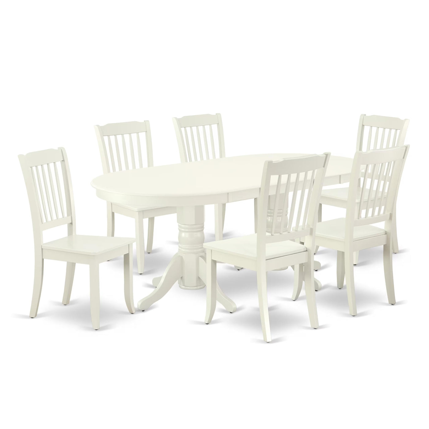 East West Furniture - Vada7-Lwh-W - Dining Room Setintroducing A 7-Piece Kitchen Dining Table Set With A Double Pedestal Dining Table And 6 Kitchen Chairs, It Enhances Any Kitchen'S Aesthetics. This Charming Set Suits Compact Spaces Without Sacrificing Style, Providing A Cozy Addition To Dining Areas. Seating Up To 6 Individuals, It Accommodates Family Or Friends Comfortably. The Contemporary Dining Table Boasts A Linen White Finish That Seamlessly Extends From The Tabletop To The Double Pedestal Legs, Complementing Various Decor Styles. Crafted From Top-Quality Asian Rubber Wood, Known For Its Durability And Eco-Friendliness, This Set Excludes Heat-Treated Wood, Plywood, Veneer, Or Laminated Wood. The Kitchen Chair Seats Feature Hardwood For Comfort, With High Backrests Supporting The Spine'S Natural Curve. Wide Seats Add Extra Comfort. Perfect For Adding Sophistication To The Kitchen, This Budget-Friendly, Durable, And Comfortable Dining Set Is Ideal For Memorable Dining Experiences With Loved Ones.Product Features: Material: Asian Hardwood Color: Linen White Table Dimensions: Length: 76.3/59; Width: 40; Height: 30. Chair Dimensions: Length: 22; Width: 18; Height: 38. Weight Capacity: 300 Lbsincludes: An Oval Table And 6 Wooden Chairshardware Package And Instruction Manual Are Located In/Under The Seat.