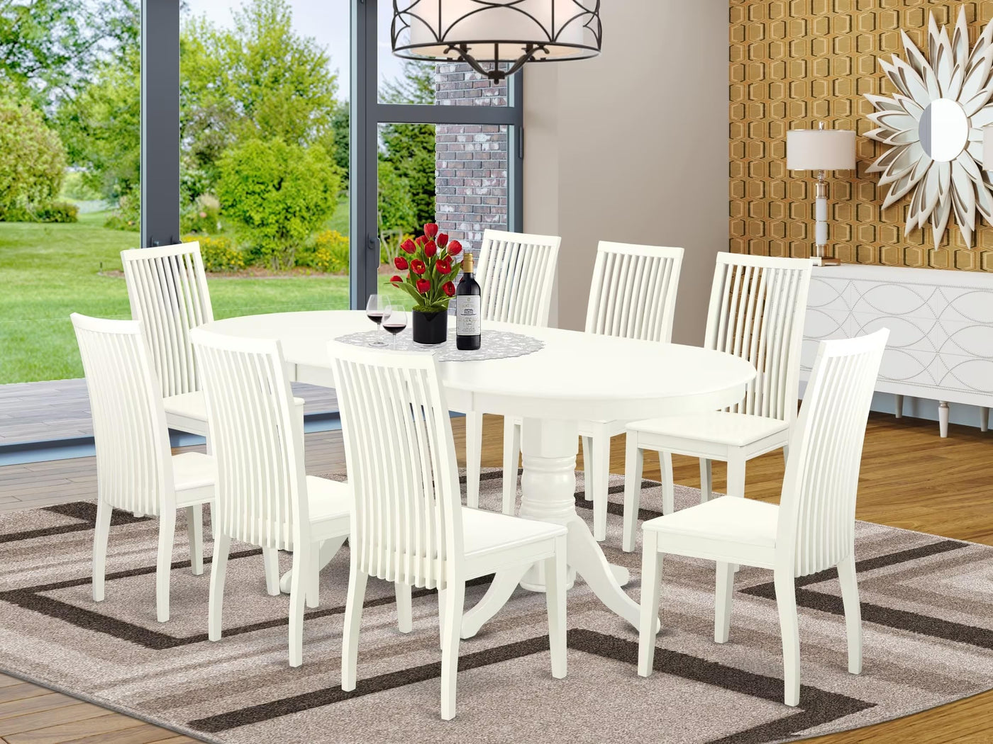 East West Furniture - Vaip9-Lwh-W - Dining Room Setthe Kitchen Set Has Been Designed With A Fashionable And Sleek Style That Will Complement And Enhance The Room It Occupies. It Features A Stunning Hardwood Kitchen Table Top Supported By A Sturdy Carved Pedestal. The Table Is Oval-Shaped With Beveled Edges, Creating A Warm And Inviting Atmosphere In The Kitchen. It Is Finished In A Rich Linen White Color, And You Have The Option To Choose Between Hardwood Or Padded Seat Chairs To Accompany It. One Of The Standout Features Of This Kitchen Table Is Its Built-In Self-Storage Butterfly Leaf, Which Can Be Discreetly Folded Underneath The Tabletop When Not In Use. This Feature Provides Maximum Flexibility, Allowing You To Host Intimate Dinners Or Larger Family Gatherings With Ease. The Table Itself Is Crafted From High-Quality Rubber Wood, Also Known As Asian Hardwood, Ensuring Durability And A Modern Aesthetic. The Dining Chairs That Come With This Set Are Designed With Solid Wood Seats, Giving Them A Sleek And Minimalist Appearance. These Chairs Not Only Add Elegance And Sophistication To Any Room But Also Prioritize Your Comfort With Their Ergonomic Design, Reducing The Risk Of Back Pain. The Standard Shape, Size, And Design Of This Dining Set Contribute To Its Overall Attractiveness In Any Dining Area. If You'Re Looking For A Contemporary, Budget-Friendly, Durable, And Comfortable Dining Set To Enjoy Quality Time With Family And Friends, This Option Is Worth Considering.Product Features: Material: Asian Hardwood Color: Linen White Table Dimensions: Length: 76.3/59; Width: 40; Height: 30. Chair Dimensions: Length: 21; Width: 18; Height: 39. Weight Capacity: 300 Lbs.Includes: An Oval Table And 8 Wooden Chairshardware Package And Instruction Manual Are Located In/Under The Seat.