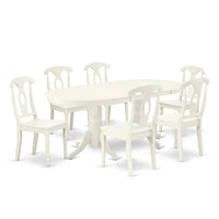 East West Furniture - Vake7-Lwh-W - Dining Room Setthis Exquisite Kitchen Set Boasts A Stylish Design With Clean Lines That Define Its Space. The Dining Table, Equipped With A Convenient Self-Storage Butterfly Leaf, Accommodates 4 To 8 People. The Splendid Hardwood Tabletop Is Supported By A Sturdy Carved Pedestal Base, Creating An Inviting Atmosphere In Your Kitchen. Finished In A Rich Linen White, The Table Is Available With Either Hardwood Or Cushioned Seat Chairs. The Built-In Self-Storage Butterfly Leaf Can Be Discreetly Folded Under The Tabletop When Not In Use, Offering Maximum Flexibility For Intimate Dinners Or Large Family Gatherings. Crafted From Top-Quality Rubber Wood, Also Known As Asian Hardwood, The Table Ensures Durability Without Relying On Heat-Treated Pressed Wood Materials Like Mdf, Particle Board, Or Veneer. The Dining Chairs Complement The Linen White Finish And Feature Solid Wooden Seats, Enhancing The Antique Charm Of Your Dining Room And Ensuring A Comfortable And Stable Seating Experience. The Ergonomic Design Of The Chair Frames Promotes Spinal Comfort, Reducing The Risk Of Back Pain. The Coordinated Color Scheme Between The Chairs And The Table Creates An Appealing Contrast In Your Kitchen Area. The Standardized Shape, Size, And Design Of This Dining Set Elevate The Overall Attractiveness Of Your Dining Space.Product Features: Material: Asian Hardwood Color: Linen White Table Dimensions: Length: 76.3/59; Width: 40; Height: 30. Chair Dimensions: Length: 21; Width: 18; Height: 38. Weight Capacity: 300 Lbs.Includes: An Oval Table And 6 Wooden Chairshardware Package And Instruction Manual Are Located In/Under The Seat.