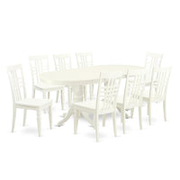 East West Furniture - Valg9-Lwh-W - Dining Room Setfeaturing 8 Wooden Chairs And A Double Pedestal Dining Table, Our 9-Piece Kitchen Room Table Set Adds Sophistication To Any Dining Area. The Dining Table, Endowed With A Discreetly Concealed Butterfly Leaf, Accommodates A Range Of 4 To 8 Individuals With Ease. Notably, It Boasts A Resplendent Hardwood Tabletop Accompanied By A Robustly Constructed Carved Pedestal Base, All Elegantly Finished In A Rich Linen White Hue. Complementing The Table Are The Option Of Hardwood Or Padded Seat Chairs, Distinguished By Their Striking Backs And Engineered For Optimal Comfort, Mitigating Any Risk Of Back Discomfort. Notably, The Entire Set Is Meticulously Fashioned From Top-Tier Rubber Wood, Known As Asian Hardwood, Assuring Its Longevity Without Resorting To Heat-Treated Pressed Wood Materials Such As Mdf, Particle Board, Or Veneer. The Contemporary Design Of The Dining Chairs Exudes An Air Of Sophistication, Their Graceful Curves Elegantly Cascading To The Floor. Beyond Aesthetics, These Chairs Are Engineered For Comfort, Lending Comprehensive Spinal Support And Reducing The Potential For Back Strain. In Terms Of Dimensions, Shape, And Design, This Dining Set Elevates The Aesthetic Allure Of The Dining Area. Offering An Amalgamation Of Contemporary Elegance, Budget-Friendly Pricing, Unwavering Durability, And Comfort, It Stands As An Excellent Choice For Those Seeking To Craft Memorable Dining Experiences With Family And Friends.Product Features: Material: Asian Hardwood Color: Linen White Table Dimensions: Length: 76.3/59; Width: 40; Height: 30 Chair Dimensions: Length: 23; Width: 18; Height: 39. Weight Capacity: 300 Lbs.Includes: An Oval Table And 8 Wooden Chairshardware Package And Instruction Manual Are Located In/Under The Seat.